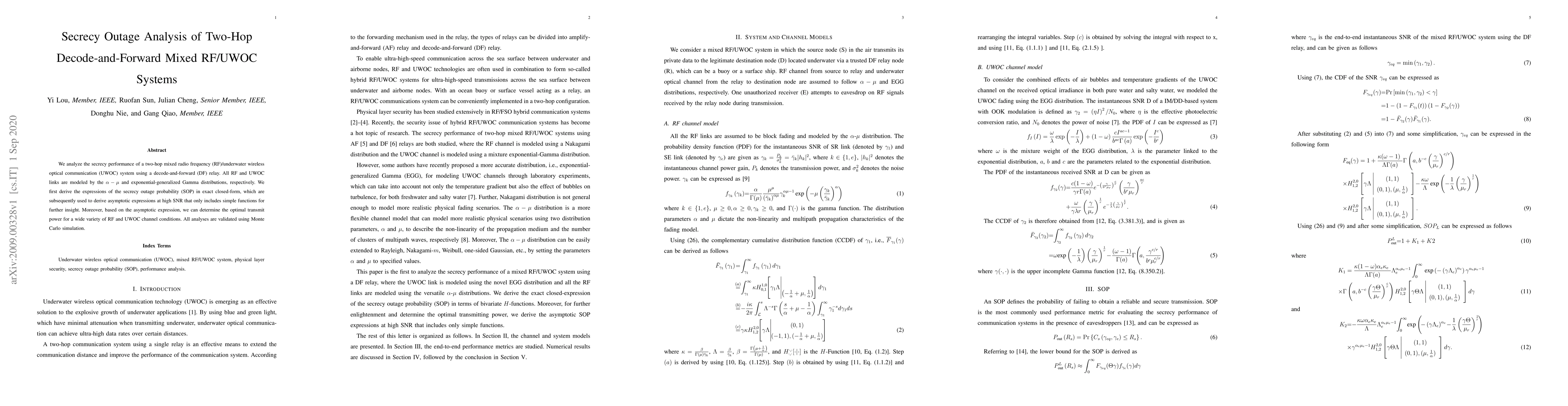 The paper presents exact closed-form expressions and asymptotic analysis for SOP in two-hop mixed RF/UWOC systems, utilizing $\alpha-\mu$ and exponential-generalized Gamma distributions.