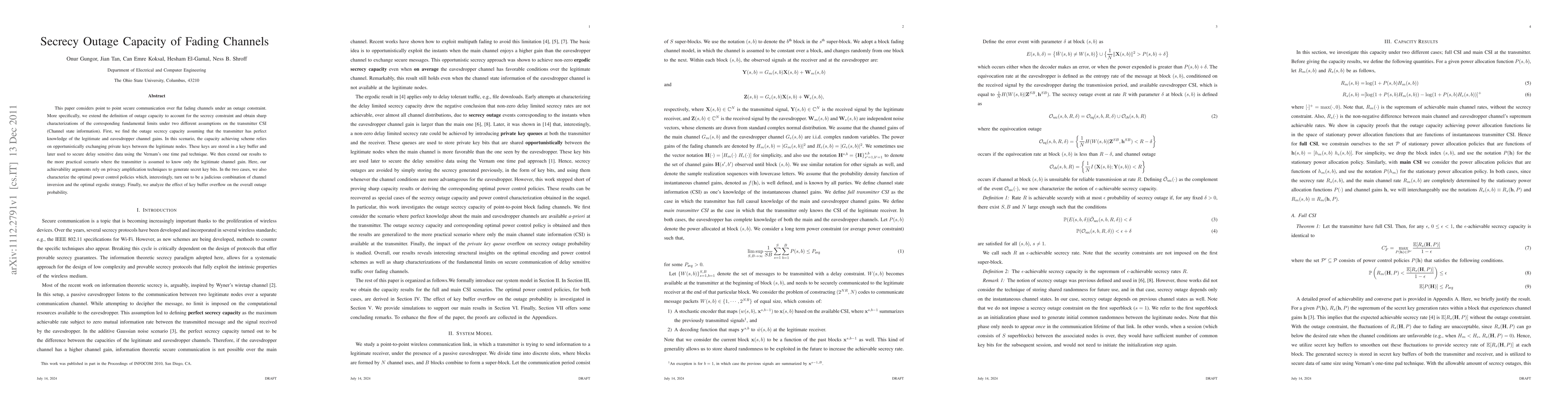 This paper explores secure communication over fading channels under an outage constraint, defining the secrecy outage capacity and characterizing its limits under different transmitter CSI scenarios. It finds optimal capacity-achieving schemes and power control policies, and analyzes the impact of key buffer overflow on outage probability.