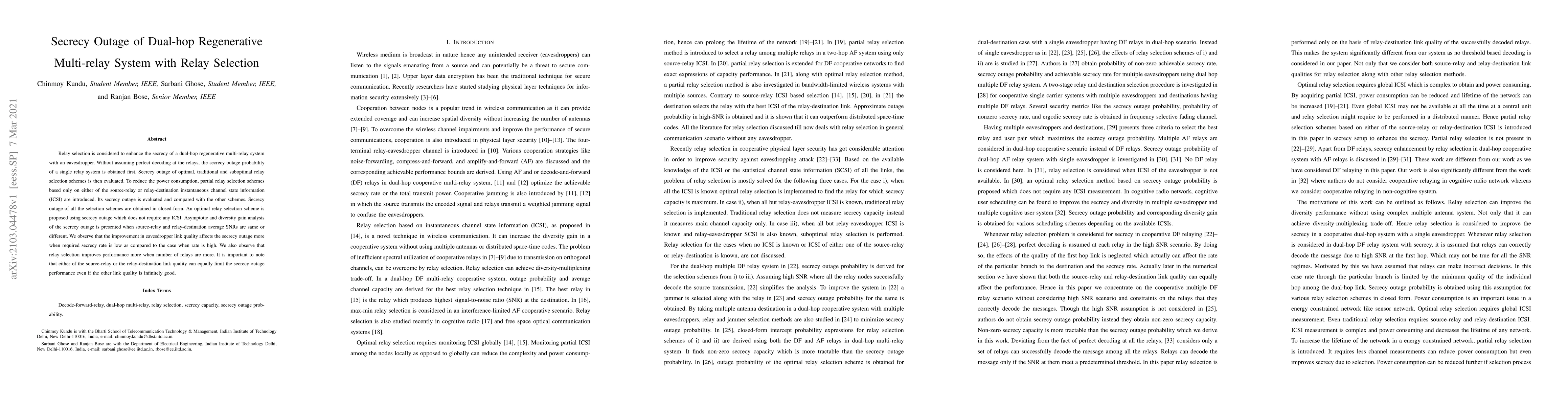 This paper evaluates secrecy outage probabilities in dual-hop multi-relay systems with relay selection, comparing optimal, traditional, and suboptimal schemes. It introduces partial selection schemes based on limited channel state information and proposes an optimal relay selection scheme without full channel knowledge.