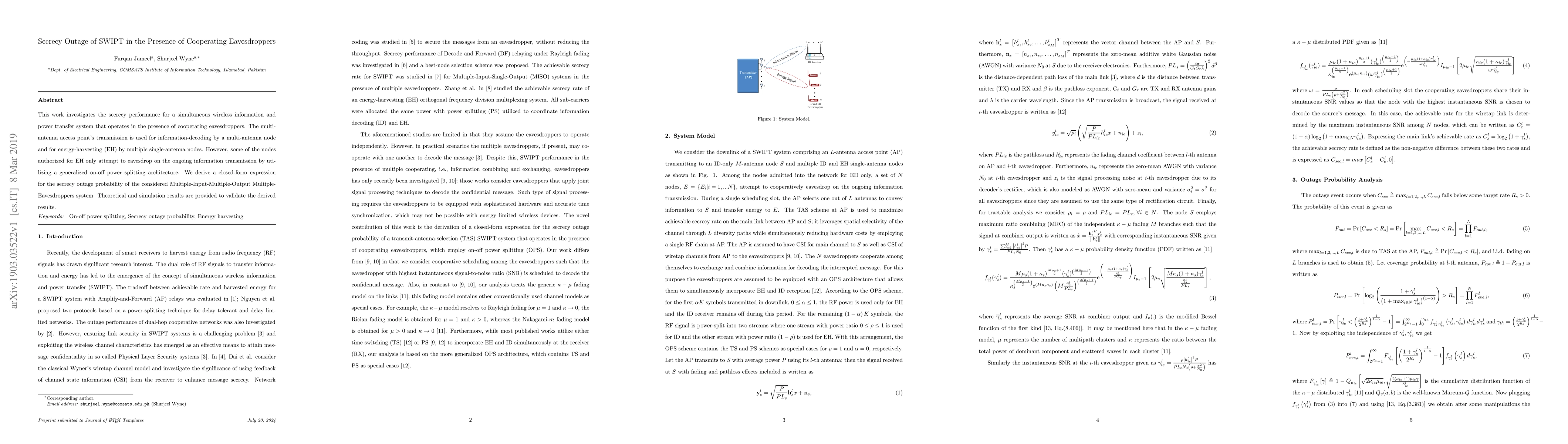 This paper examines the secrecy performance in a SWIPT system with cooperating eavesdroppers, deriving a closed-form expression for the secrecy outage probability in a MIMO-ME system. The study validates the theoretical results through simulations.