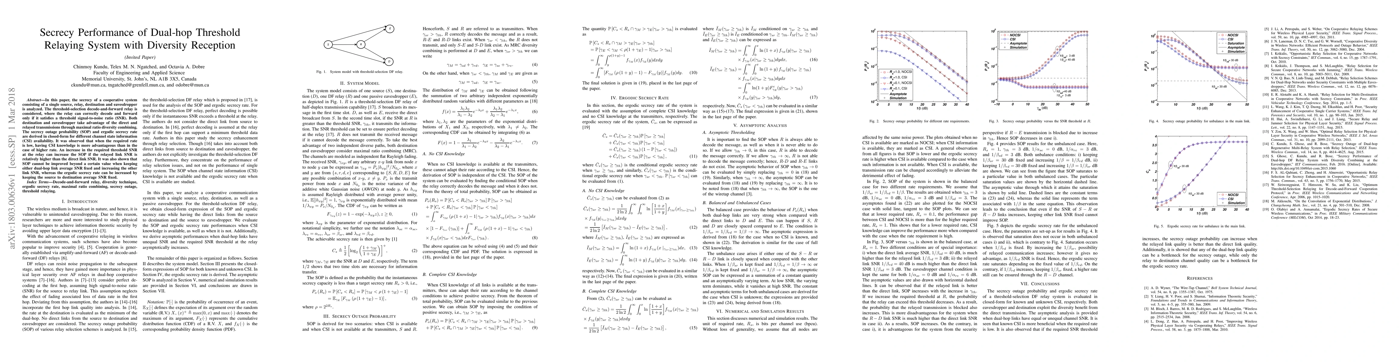 This paper analyzes the secrecy performance of a dual-hop relay system using threshold decode-and-forward relaying, deriving closed-form expressions for secrecy outage probability and ergodic secrecy rate under various channel conditions. It finds that CSI knowledge is more beneficial for low data rates, and increasing the relay's threshold SNR can adversely affect secrecy if the relayed link SNR is higher than the direct link SNR.
