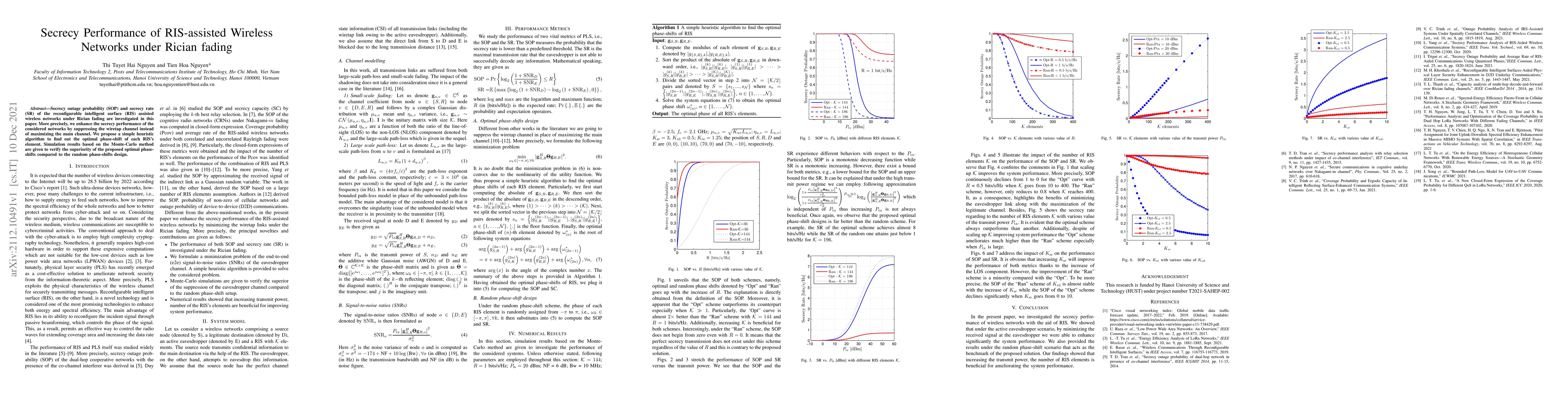 Secrecy outage probability (SOP) and secrecy rate (SR) of the reconfigurable intelligent surface (RIS) assisted wireless networks under Rician fading are investigated in this paper. More precisely, we enhance the secrecy performance of the considered networks by suppressing the wiretap channel instead of maximizing the main channel. We propose a simple heuristic algorithm to find out the optimal phase-shift of each RIS's element. Simulation results based on the Monte-Carlo method are given to verify the superiority of the proposed optimal phase-shifts compared to the random phase-shifts design.