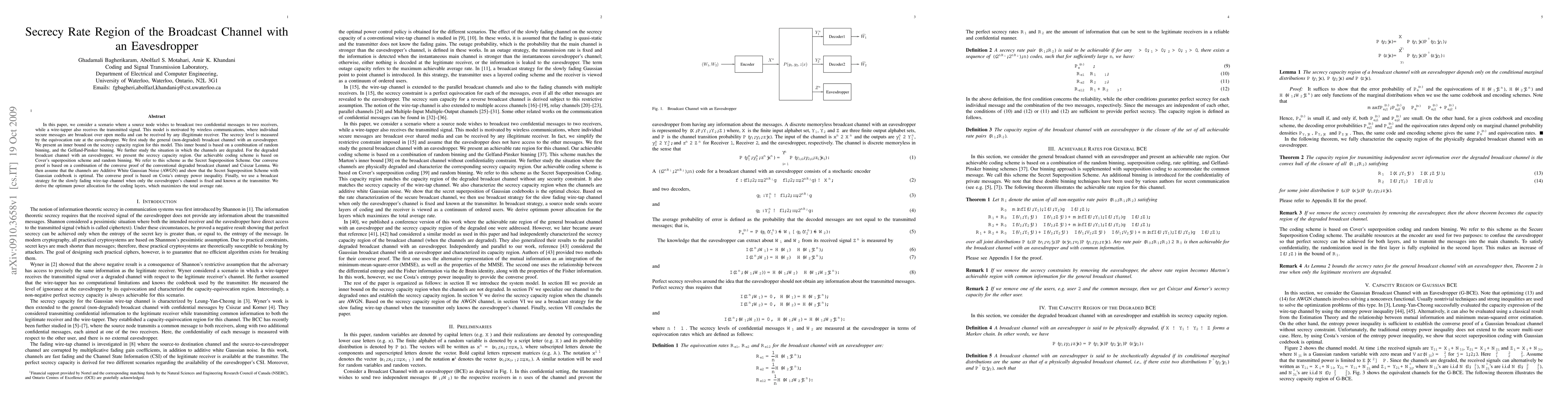 This paper investigates the secrecy rate region for a broadcast channel with an eavesdropper, focusing on scenarios where confidential messages are broadcast to legitimate receivers while an eavesdropper intercepts the signals. It presents inner and outer bounds for secrecy capacity in both general and degraded channel models, employing random binning and superposition coding strategies. The Secret Superposition Scheme is shown to be optimal for Additive White Gaussian Noise channels.