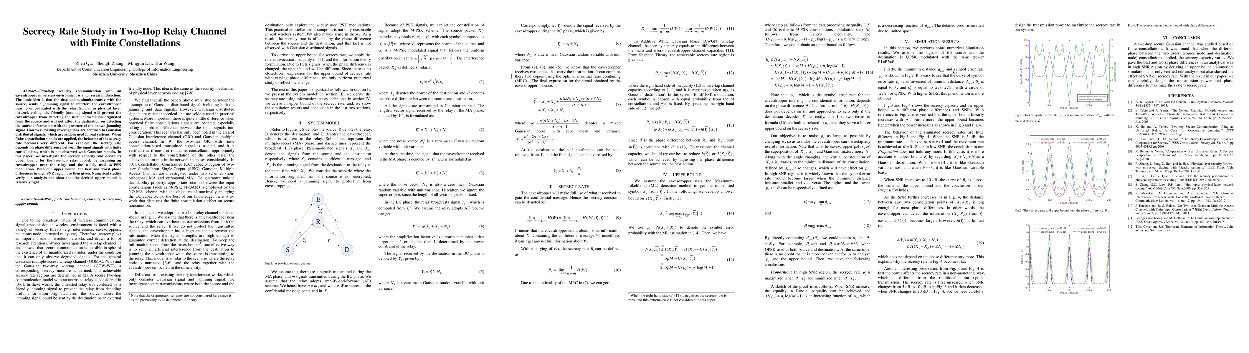 Two-hop security communication with an eavesdropper in wireless environment is a hot research direction. The basic idea is that the destination, simultaneously with the source, sends a jamming signal to interfere the eavesdropper near to or co-located with the relay. Similar as physical layer network coding, the friendly jamming signal will prevent the eavesdropper from detecting the useful information originated from the source and will not affect the destination on detecting the source information with the presence of the known jamming signal. However, existing investigations are confined to Gaussian distributed signals, which are seldom used in real systems. When finite constellation signals are applied, the behavior of the secrecy rate becomes very different. For example, the secrecy rate depends on phase difference between the input signals with finite constellations, which is not observed with Gaussian signals. In this paper, we investigate the secrecy capacity and derive its upper bound for the two-hop relay model, by assuming an eavesdropper near the relay and the widely used M-PSK modulation. With our upper bound, the best and worst phase differences in high SNR region are then given. Numerical studies verify our analysis and show that the derived upper bound is relatively tight.