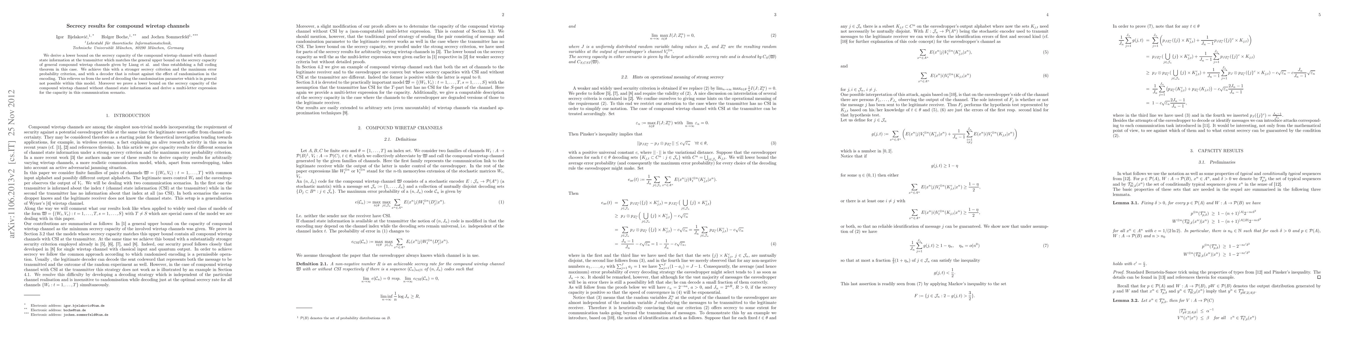 We derive a lower bound on the secrecy capacity of the compound wiretap channel with channel state information at the transmitter which matches the general upper bound on the secrecy capacity of general compound wiretap channels given by Liang et al. and thus establishing a full coding theorem in this case. We achieve this with a stronger secrecy criterion and the maximum error probability criterion, and with a decoder that is robust against the effect of randomisation in the encoding. This relieves us from the need of decoding the randomisation parameter which is in general not possible within this model. Moreover we prove a lower bound on the secrecy capacity of the compound wiretap channel without channel state information and derive a multi-letter expression for the capacity in this communication scenario.