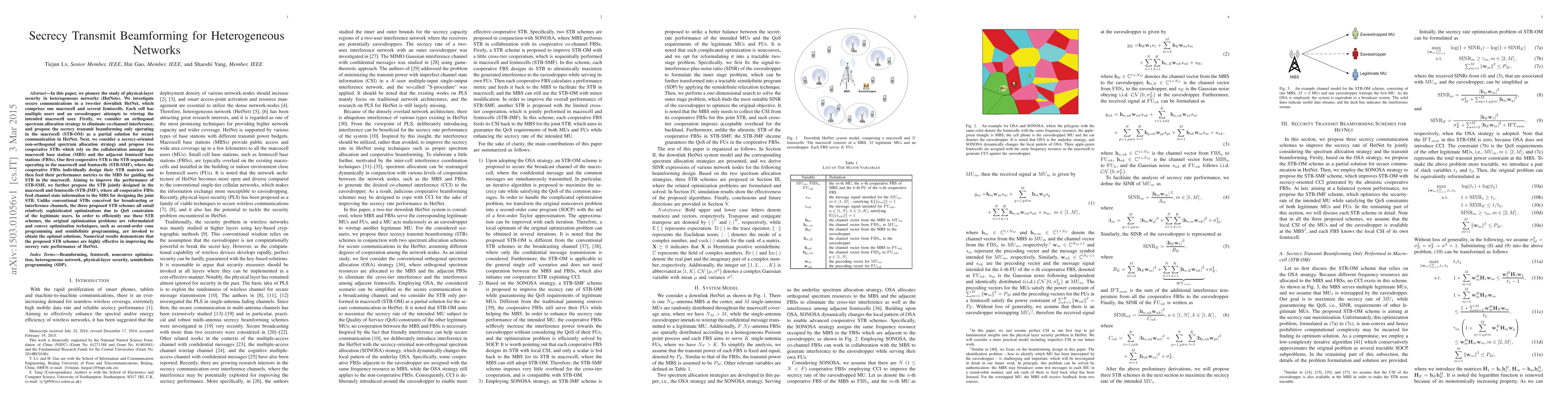 In this paper, we pioneer the study of physical-layer security in heterogeneous networks (HetNets). We investigate secure communications in a two-tier downlink HetNet, which comprises one macrocell and several femtocells. Each cell has multiple users and an eavesdropper attempts to wiretap the intended macrocell user. Firstly, we consider an orthogonal spectrum allocation strategy to eliminate co-channel interference, and propose the secrecy transmit beamforming only operating in the macrocell (STB-OM) as a partial solution for secure communication in HetNet. Next, we consider a secrecy-oriented non-orthogonal spectrum allocation strategy and propose two cooperative STBs which rely on the collaboration amongst the macrocell base station (MBS) and the adjacent femtocell base stations (FBSs). Our first cooperative STB is the STB sequentially operating in the macrocell and femtocells (STB-SMF), where the cooperative FBSs individually design their STB matrices and then feed their performance metrics to the MBS for guiding the STB in the macrocell. Aiming to improve the performance of STB-SMF, we further propose the STB jointly designed in the macrocell and femtocells (STB-JMF), where all cooperative FBSs feed channel state information to the MBS for designing the joint STB. Unlike conventional STBs conceived for broadcasting or interference channels, the three proposed STB schemes all entail relatively sophisticated optimizations due to QoS constraints of the legitimate users. In order to efficiently use these STB schemes, the original optimization problems are reformulated and convex optimization techniques, such as second-order cone programming and semidefinite programming, are invoked to obtain the optimal solutions. Numerical results demonstrate that the proposed STB schemes are highly effective in improving the secrecy rate performance of HetNet.