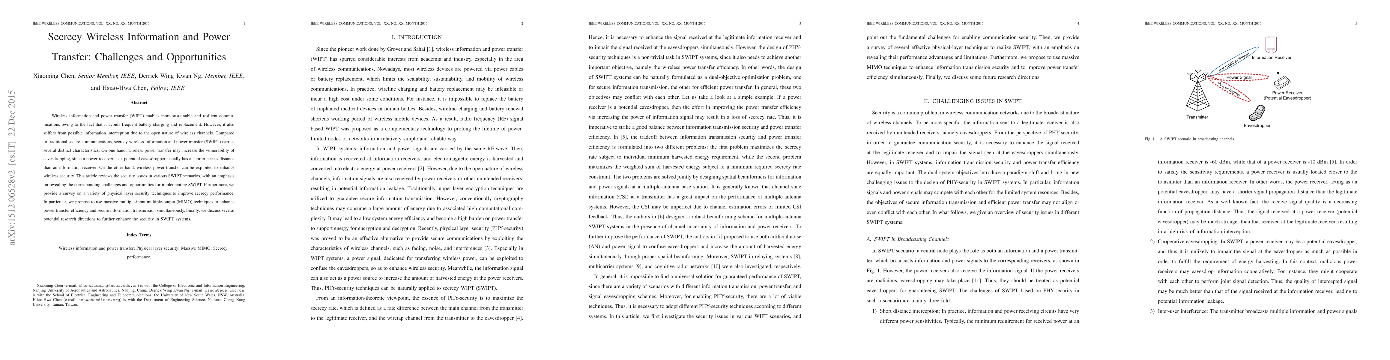Wireless information and power transfer (WIPT) enables more sustainable and resilient communications owing to the fact that it avoids frequent battery charging and replacement. However, it also suffers from possible information interception due to the open nature of wireless channels. Compared to traditional secure communications, secrecy wireless information and power transfer (SWIPT) carries several distinct characteristics. On one hand, wireless power transfer may increase the vulnerability of eavesdropping, since a power receiver, as a potential eavesdropper, usually has a shorter access distance than an information receiver. On the other hand, wireless power transfer can be exploited to enhance wireless security. This article reviews the security issues in various SWIPT scenarios, with an emphasis on revealing the corresponding challenges and opportunities for implementing SWIPT. Furthermore, we provide a survey on a variety of physical layer security techniques to improve secrecy performance. In particular, we propose to use massive multiple-input multiple-output (MIMO) techniques to enhance power transfer efficiency and secure information transmission simultaneously. Finally, we discuss several potential research directions to further enhance the security in SWIPT systems.
