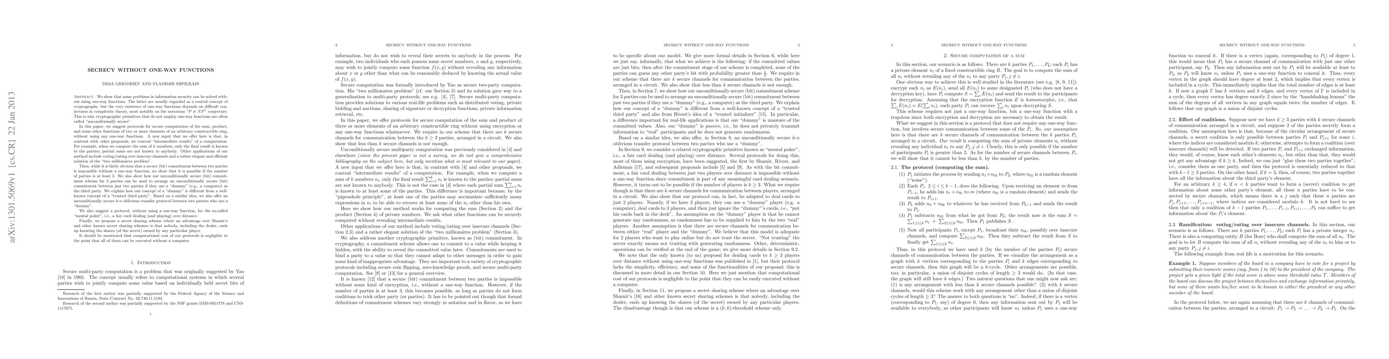 We show that some problems in information security can be solved without using one-way functions. The latter are usually regarded as a central concept of cryptography, but the very existence of one-way functions depends on difficult conjectures in complexity theory, most notably on the notorious "$P \ne NP$" conjecture. In this paper, we suggest protocols for secure computation of the sum, product, and some other functions, without using any one-way functions. A new input that we offer here is that, in contrast with other proposals, we conceal "intermediate results" of a computation. For example, when we compute the sum of $k$ numbers, only the final result is known to the parties; partial sums are not known to anybody. Other applications of our method include voting/rating over insecure channels and a rather elegant and efficient solution of Yao's "millionaires' problem". Then, while it is fairly obvious that a secure (bit) commitment between two parties is impossible without a one-way function, we show that it is possible if the number of parties is at least 3. We also show how our (bit) commitment scheme for 3 parties can be used to arrange an unconditionally secure (bit) commitment between just two parties if they use a "dummy" (e.g., a computer) as the third party. We explain how our concept of a "dummy" is different from a well-known concept of a "trusted third party". We also suggest a protocol, without using a one-way function, for "mental poker", i.e., a fair card dealing (and playing) over distance. We also propose a secret sharing scheme where an advantage over Shamir's and other known secret sharing schemes is that nobody, including the dealer, ends up knowing the shares owned by any particular player. It should be mentioned that computational cost of our protocols is negligible to the point that all of them can be executed without a computer.