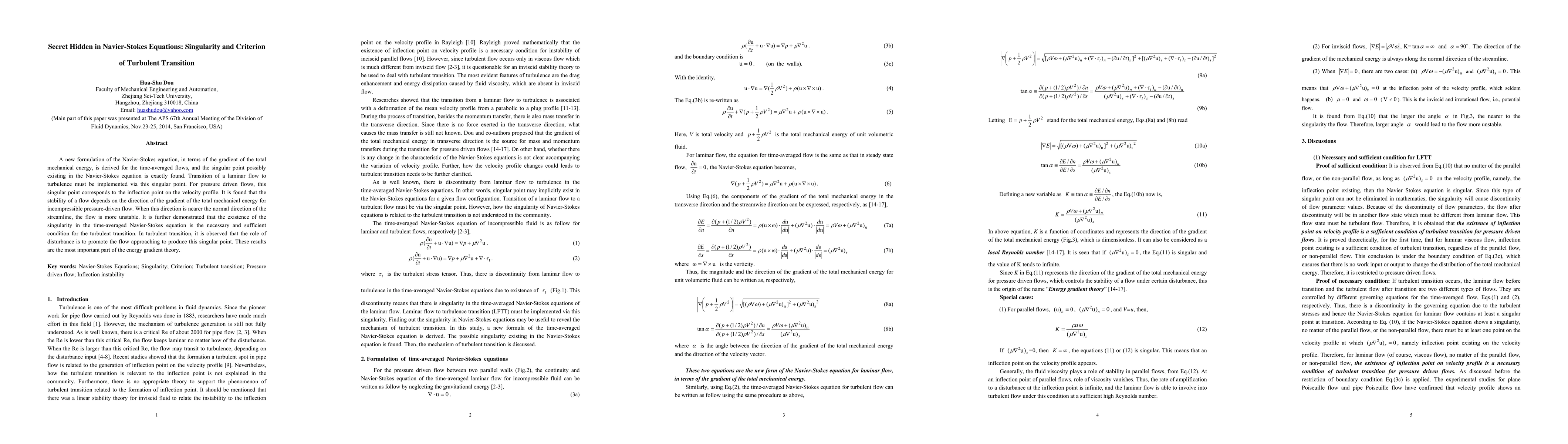 A new formulation of the Navier-Stokes equation, in terms of the gradient of the total mechanical energy, is derived for the time-averaged flows, and the singular point possibly existing in the Navier-Stokes equation is exactly found. Transition of a laminar flow to turbulence must be implemented via this singular point. For pressure driven flows, this singular point corresponds to the inflection point on the velocity profile. It is found that the stability of a flow depends on the direction of the gradient of the total mechanical energy for incompressible pressure-driven flow. When this direction is nearer the normal direction of the streamline, the flow is more unstable. It is further demonstrated that the existence of the singularity in the time-averaged Navier-Stokes equation is the necessary and sufficient condition for the turbulent transition. In turbulent transition, it is observed that the role of disturbance is to promote the flow approaching to produce this singular point. These results are the most important part of the energy gradient theory.