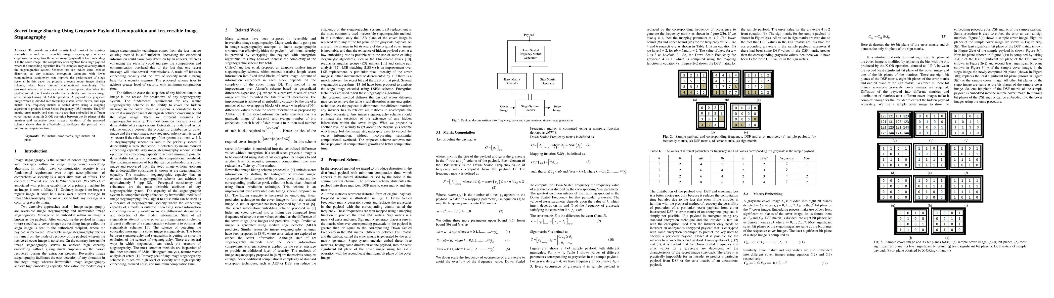 This paper proposes a secure secret image sharing scheme with minimal computational complexity, using grayscale payload decomposition and irreversible steganography. The method divides the payload into frequency, error, and sign matrices, embedding them into cover images via bit X-OR operations, achieving low distortion and high performance.