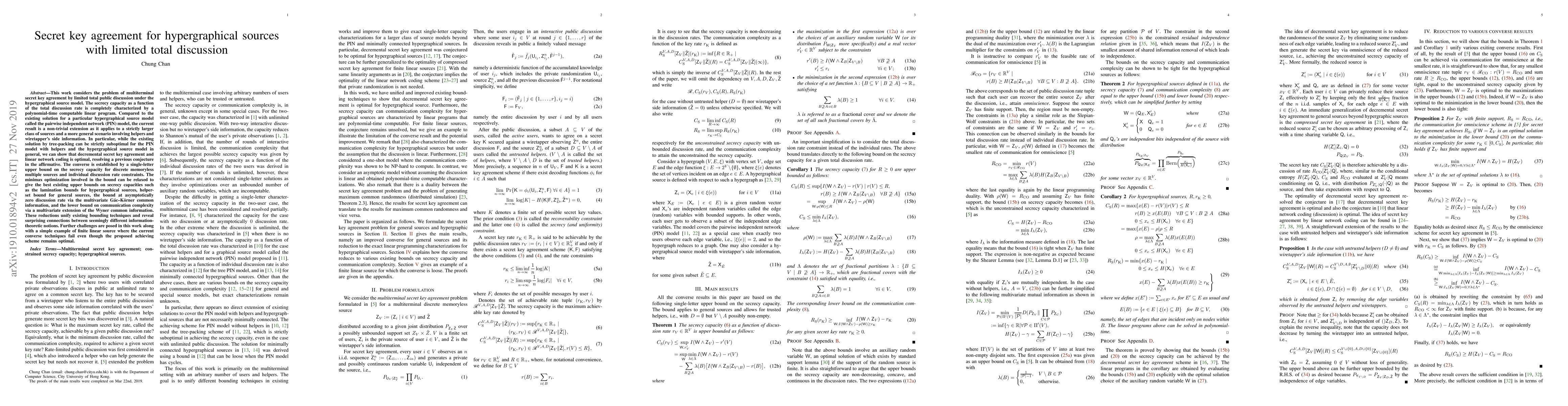 This work considers the problem of multiterminal secret key agreement by limited total public discussion under the hypergraphical source model. The secrecy capacity as a function of the total discussion rate is completely characterized by a polynomial-time computable linear program. Compared to the existing solution for a particular hypergraphical source model called the pairwise independent network (PIN) model, the current result is a non-trivial extension as it applies to a strictly larger class of sources and a more general scenario involving helpers and wiretapper's side information. In particular, while the existing solution by tree-packing can be strictly suboptimal for the PIN model with helpers and the hypergraphical source model in general, we can show that decremental secret key agreement and linear network coding is optimal, resolving a previous conjecture in the affirmative. The converse is established by a single-letter upper bound on the secrecy capacity for discrete memoryless multiple sources and individual discussion rate constraints. The minimax optimization involved in the bound can be relaxed to give the best existing upper bounds on secrecy capacities such as the lamination bounds for hypergraphical sources, helper-set bound for general sources, the bound at asymptotically zero discussion rate via the multivariate G\'ac--K\"orner common information, and the lower bound on communication complexity via a multivariate extension of the Wyner common information. These reductions unify existing bounding techniques and reveal surprising connections between seemingly different information-theoretic notions. Further challenges are posed in this work along with a simple example of finite linear source where the current converse techniques fail even though the proposed achieving scheme remains optimal.