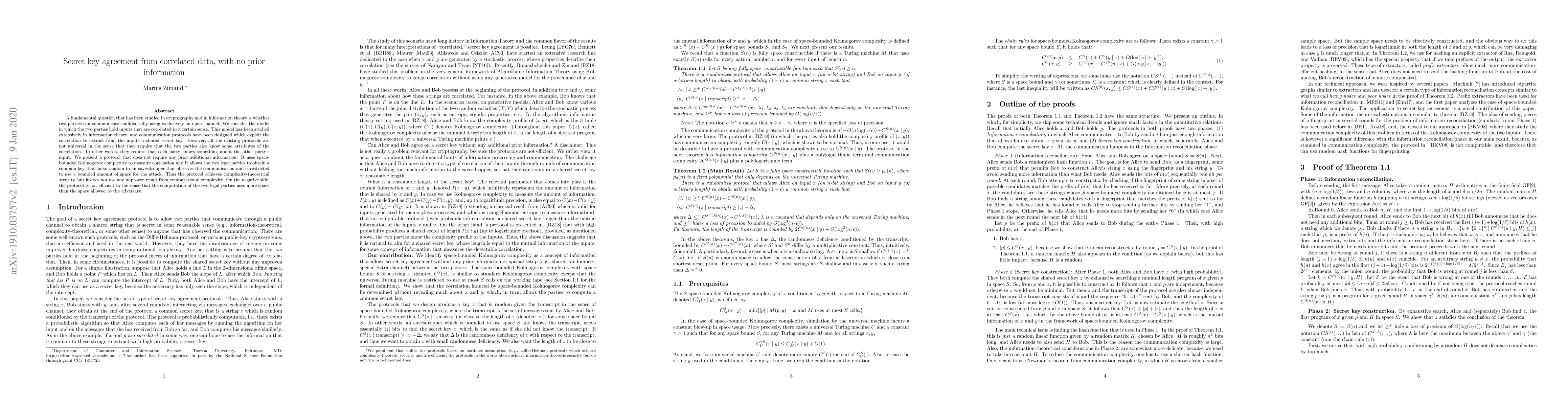 Researchers developed a new protocol for secret key agreement from correlated data without prior information, achieving complexity-theoretical security but with limited efficiency.