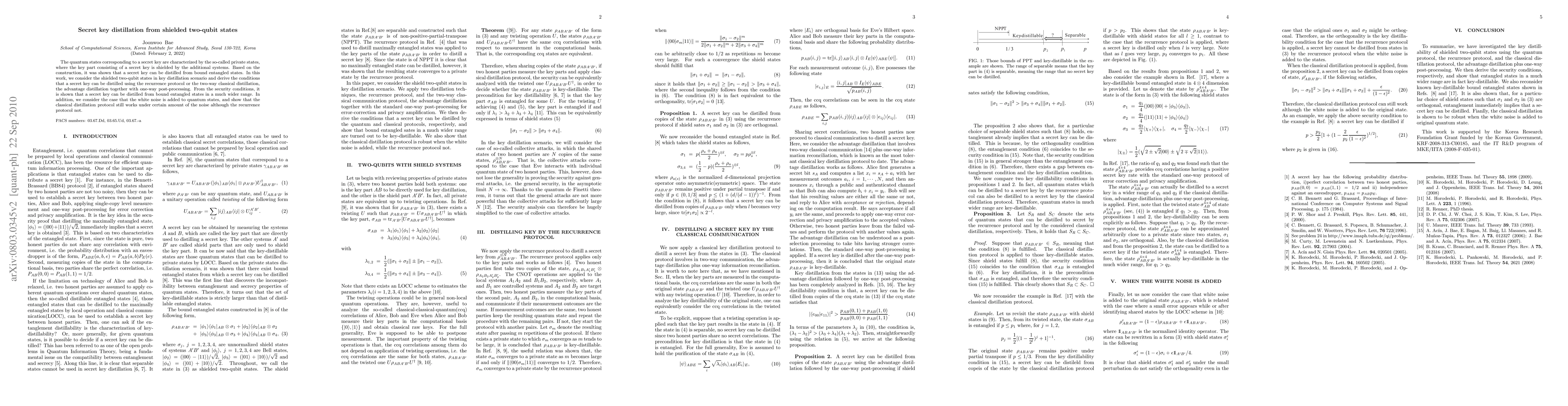 This paper explores secret key distillation from shielded two-qubit states, demonstrating that secret keys can be extracted from bound entangled states using various distillation protocols. It shows that classical distillation can still work under noise, unlike the recurrence protocol.