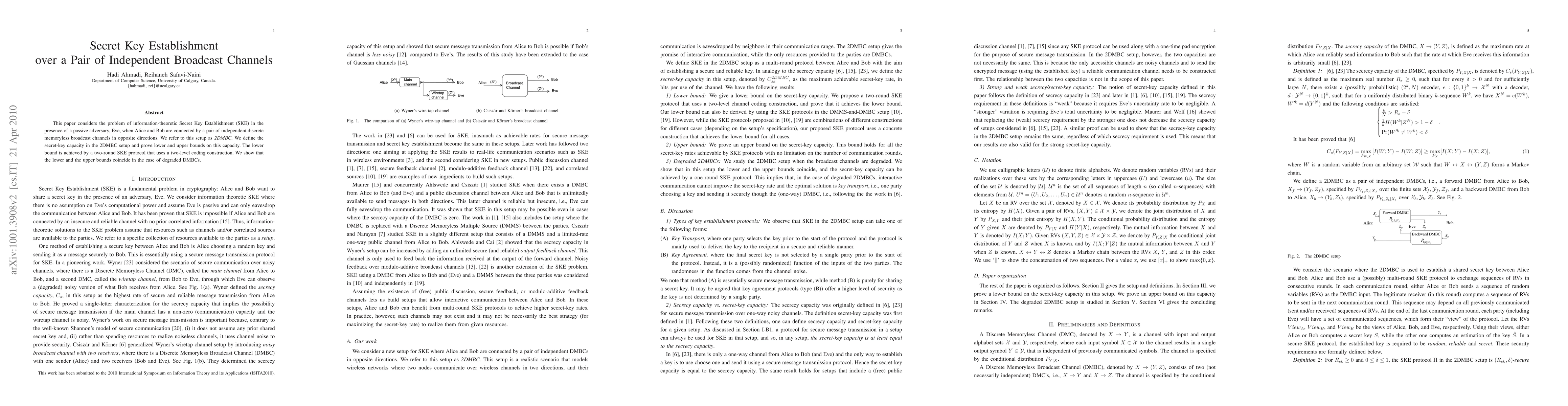 This paper considers the problem of information-theoretic Secret Key Establishment (SKE) in the presence of a passive adversary, Eve, when Alice and Bob are connected by a pair of independent discrete memoryless broadcast channels in opposite directions. We refer to this setup as 2DMBC. We define the secret-key capacity in the 2DMBC setup and prove lower and upper bounds on this capacity. The lower bound is achieved by a two-round SKE protocol that uses a two-level coding construction. We show that the lower and the upper bounds coincide in the case of degraded DMBCs.