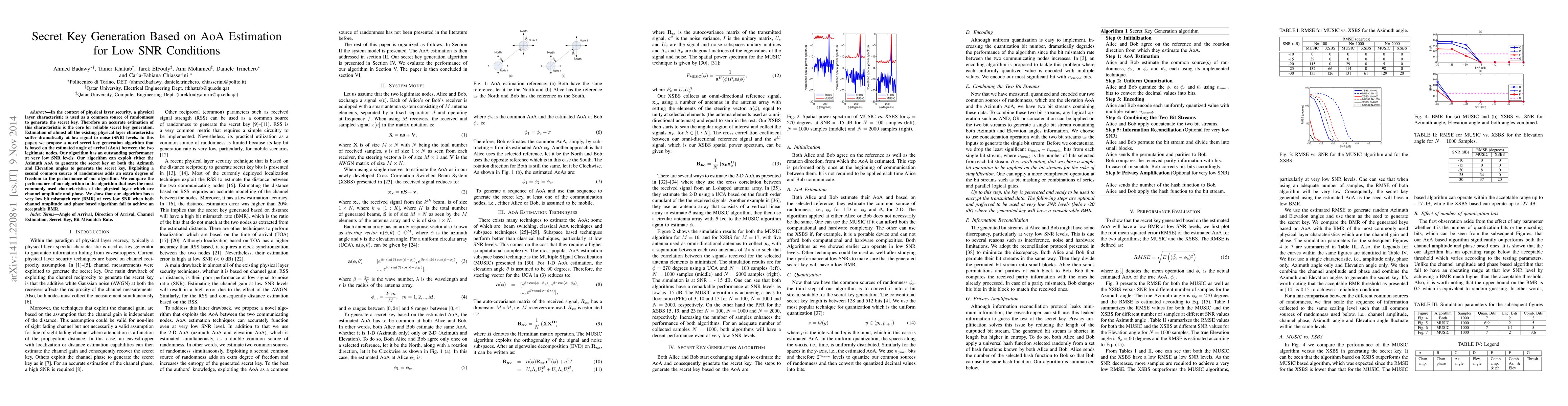 This paper proposes a novel secret key generation algorithm based on angle of arrival (AoA) estimation for low signal-to-noise ratio (SNR) conditions, demonstrating superior performance compared to traditional channel amplitude and phase methods, especially at very low SNR levels. The algorithm leverages either Azimuth or both Azimuth and Elevation angles to achieve low bit mismatch rate.