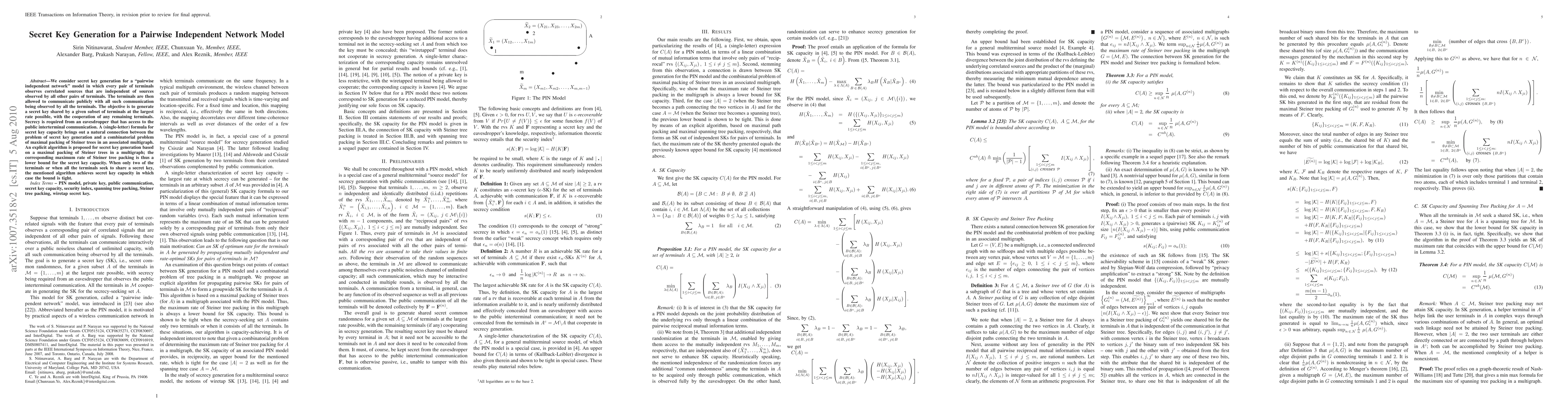 We consider secret key generation for a "pairwise independent network" model in which every pair of terminals observes correlated sources that are independent of sources observed by all other pairs of terminals. The terminals are then allowed to communicate publicly with all such communication being observed by all the terminals. The objective is to generate a secret key shared by a given subset of terminals at the largest rate possible, with the cooperation of any remaining terminals. Secrecy is required from an eavesdropper that has access to the public interterminal communication. A (single-letter) formula for secret key capacity brings out a natural connection between the problem of secret key generation and a combinatorial problem of maximal packing of Steiner trees in an associated multigraph. An explicit algorithm is proposed for secret key generation based on a maximal packing of Steiner trees in a multigraph; the corresponding maximum rate of Steiner tree packing is thus a lower bound for the secret key capacity. When only two of the terminals or when all the terminals seek to share a secret key, the mentioned algorithm achieves secret key capacity in which case the bound is tight.
