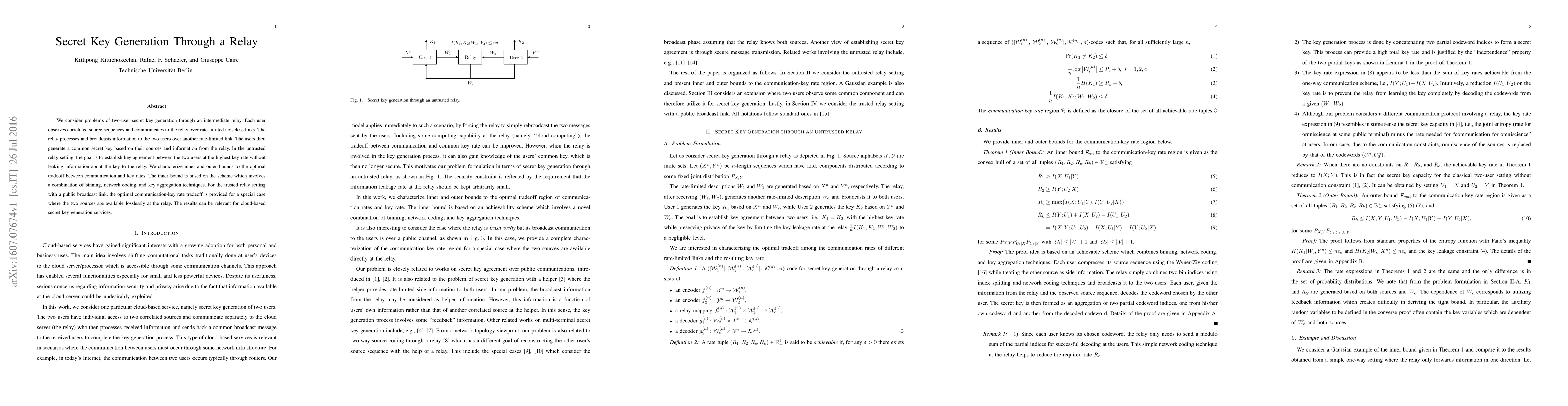 This paper explores secret key generation between two users via an intermediate relay, focusing on both untrusted and trusted relay scenarios. It establishes inner and outer bounds for key rate and communication rate, utilizing techniques like binning and network coding, and provides optimal tradeoffs for specific cases.