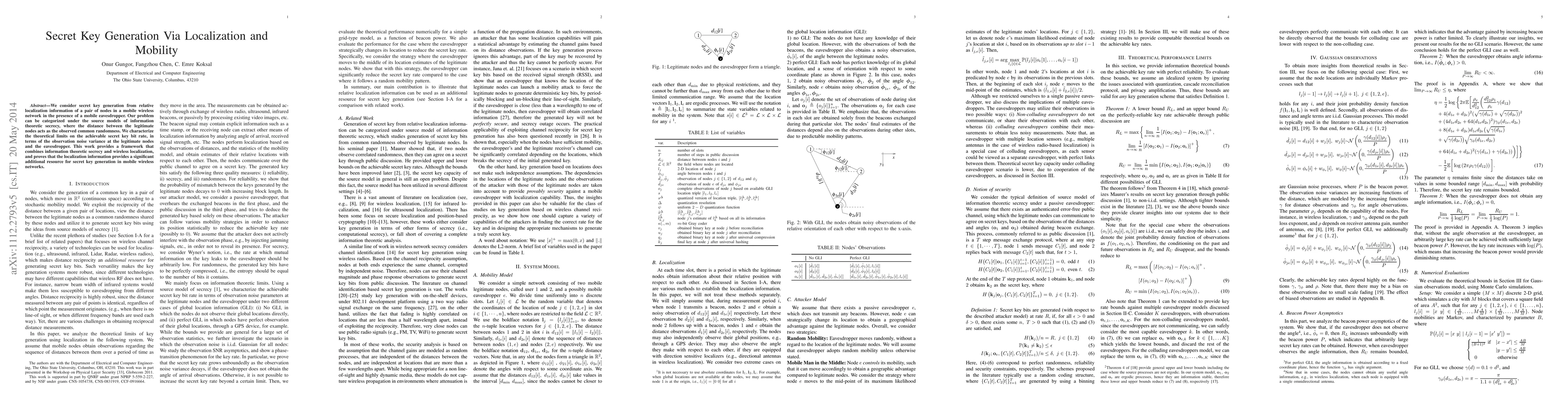 The paper analyzes secret key generation using relative localization information of nodes in a mobile wireless network, considering a mobile eavesdropper. It characterizes theoretical limits on achievable secret key bit rates based on observation noise variance at legitimate nodes and the eavesdropper.