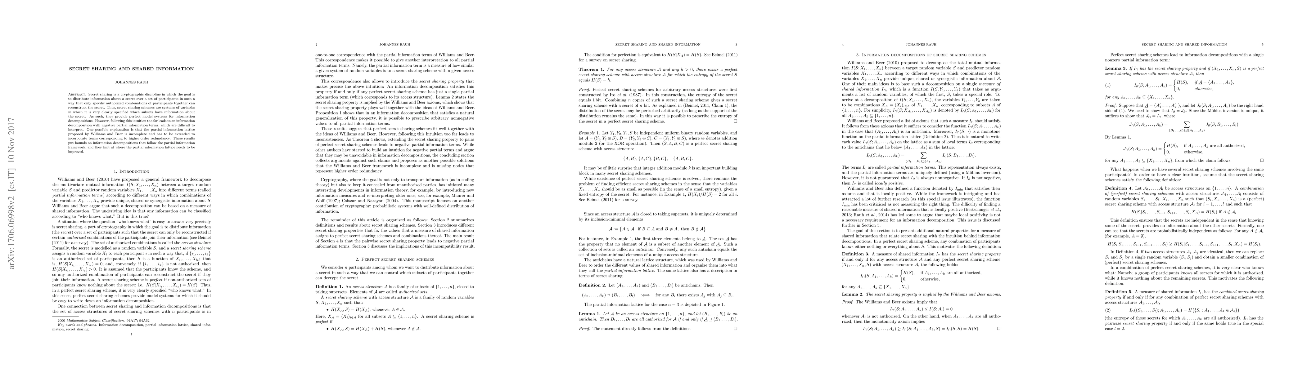 This paper discusses secret sharing schemes, which distribute secret information among participants so that only authorized subsets can reconstruct it. It explores issues with current information decomposition frameworks and suggests extending the partial information lattice to include higher-order redundancy for better interpretation.