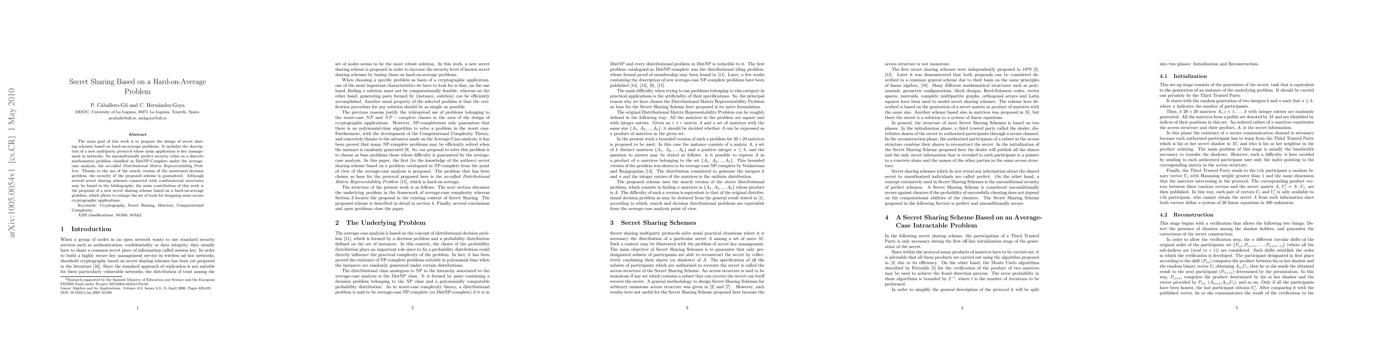 This paper proposes a novel secret sharing scheme based on hard-on-average problems, specifically the Distributional Matrix Representability Problem, for secure key management in networks. The scheme's security is unconditionally perfect and relies on the search version of the problem, expanding the toolkit for designing secure cryptographic applications.