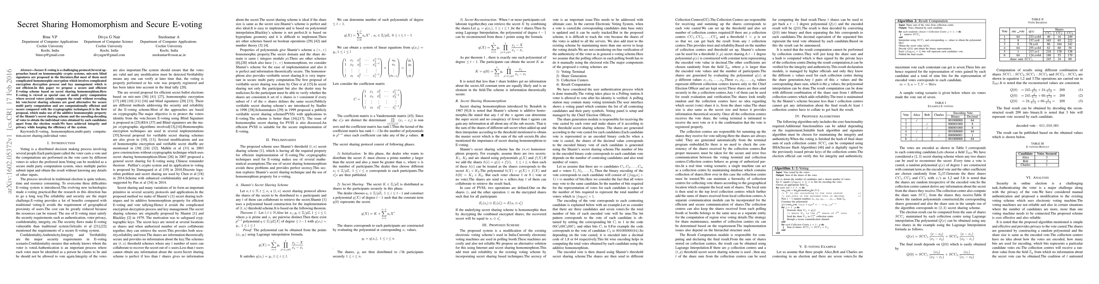 Secure E-voting is a challenging protocol. Several approaches based on homomorphic crypto systems, mix-nets blind signatures are proposed in the literature .But most of them need complicated homomorphic encryption which involves complicated encryption decryption process and key management which is not efficient. In this paper we propose a secure and efficient E-voting scheme based on secret sharing homomorphism. Here E-voting is viewed as special case of multi party computation where several voters jointly compute the result without revealing his vote. Secret sharing schemes are good alternative for secure multi party computation and are computationally efficient and secure compared with the cryptographic techniques. It is the first proposal, which makes use of the additive homomorphic property of the Shamir secret sharing scheme and the encoding decoding of votes to obtain the individual votes obtained by each candidate apart from the election result. We have achieved integrity and privacy while keeping the efficiency of the system.