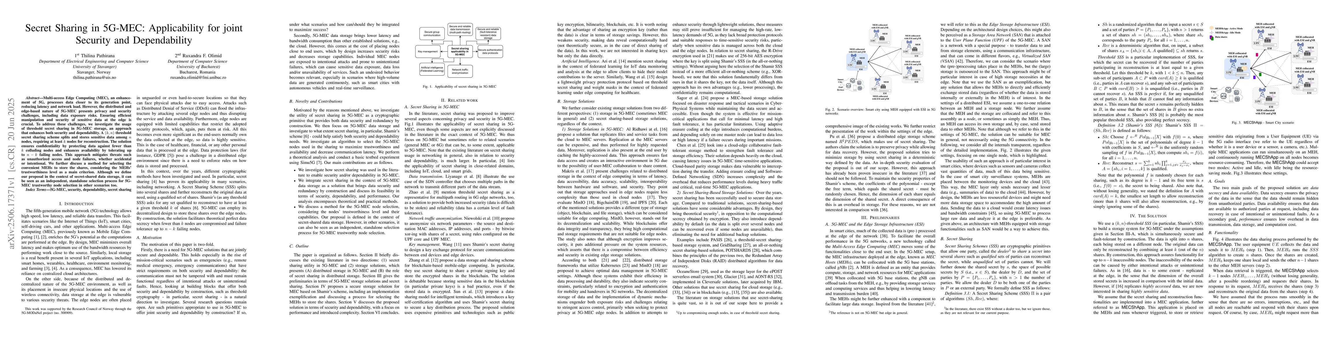 Multi-access Edge Computing (MEC), an enhancement of 5G, processes data closer to its generation point, reducing latency and network load. However, the distributed and edge-based nature of 5G-MEC presents privacy and security challenges, including data exposure risks. Ensuring efficient manipulation and security of sensitive data at the edge is crucial. To address these challenges, we investigate the usage of threshold secret sharing in 5G-MEC storage, an approach that enhances both security and dependability. A (k,n) threshold secret sharing scheme splits and stores sensitive data among n nodes, requiring at least k nodes for reconstruction. The solution ensures confidentiality by protecting data against fewer than k colluding nodes and enhances availability by tolerating up to n-k failing nodes. This approach mitigates threats such as unauthorized access and node failures, whether accidental or intentional. We further discuss a method for selecting the convenient MEHs to store the shares, considering the MEHs' trustworthiness level as a main criterion. Although we define our proposal in the context of secret-shared data storage, it can be seen as an independent, standalone selection process for 5G-MEC trustworthy node selection in other scenarios too.