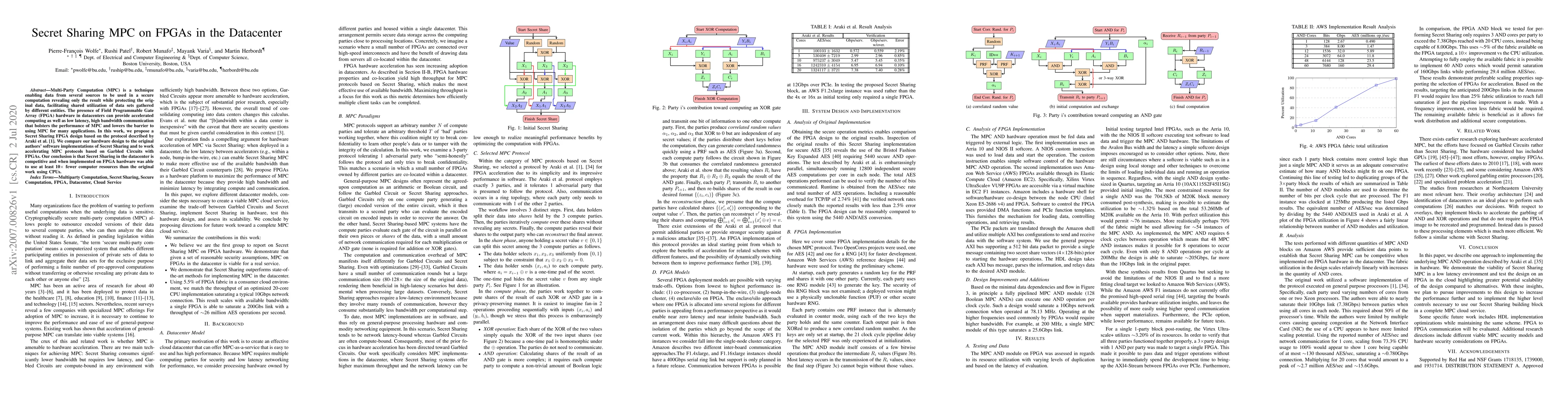 A Secret Sharing MPC design based on Araki et al.'s protocol is proposed for FPGAs in datacenters, achieving 10x fewer computer resources than CPU-based implementations.
