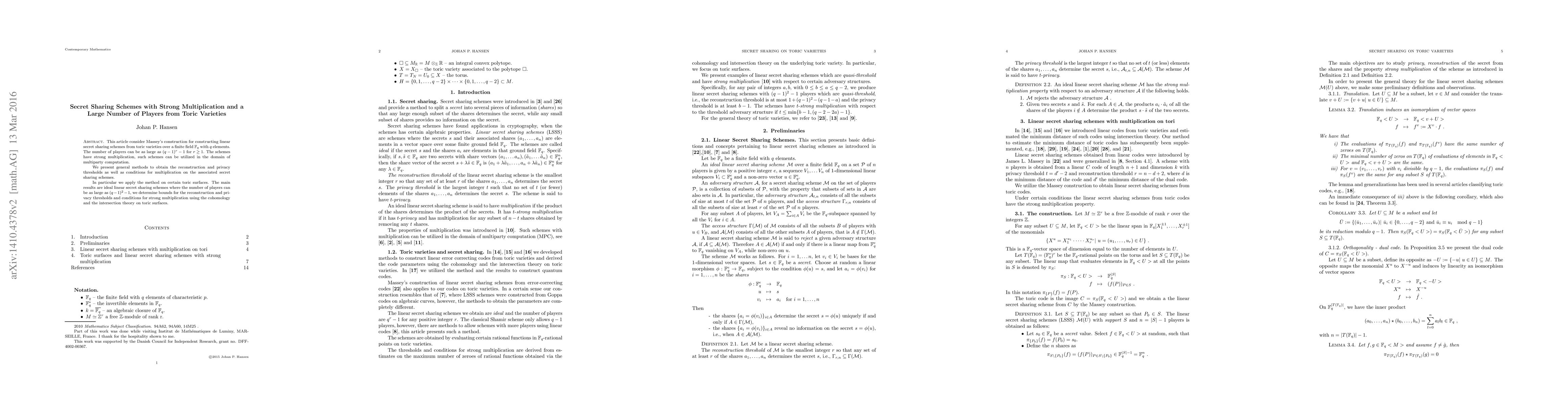 A general theory for constructing linear secret sharing schemes over a finite field $\Fq$ from toric varieties is introduced. The number of players can be as large as $(q-1)^r-1$ for $r\geq 1$. We present general methods for obtaining the reconstruction and privacy thresholds as well as conditions for multiplication on the associated secret sharing schemes. In particular we apply the method on certain toric surfaces. The main results are ideal linear secret sharing schemes where the number of players can be as large as $(q-1)^2-1$. We determine bounds for the reconstruction and privacy thresholds and conditions for strong multiplication using the cohomology and the intersection theory on toric surfaces.