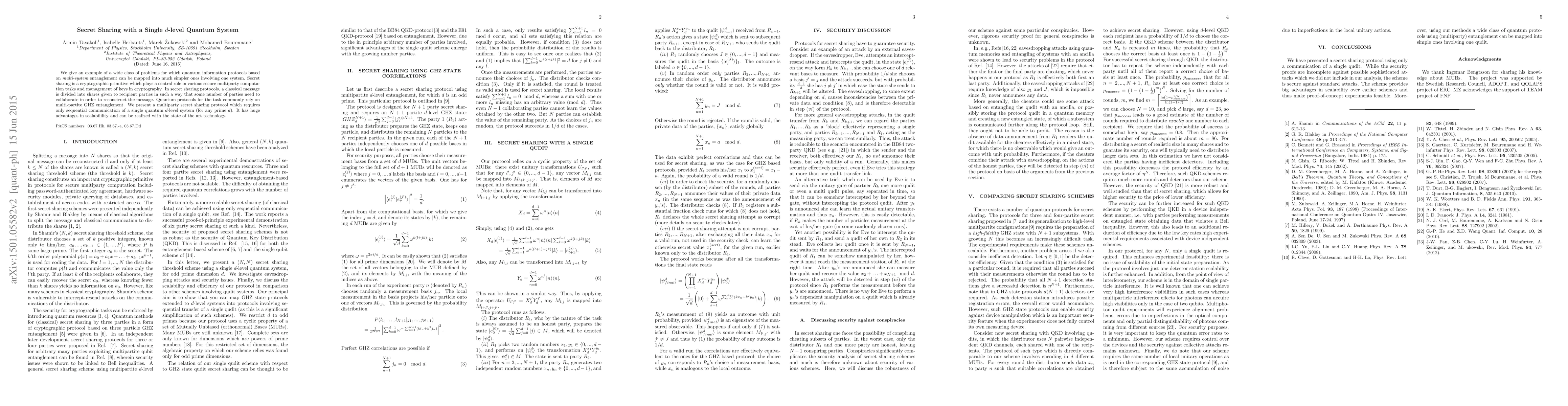 This paper presents a scalable secret sharing protocol using a single d-level quantum system, simplifying quantum information protocols that typically rely on multi-partite GHZ entanglement. This approach enhances scalability and is feasible with current quantum technology.