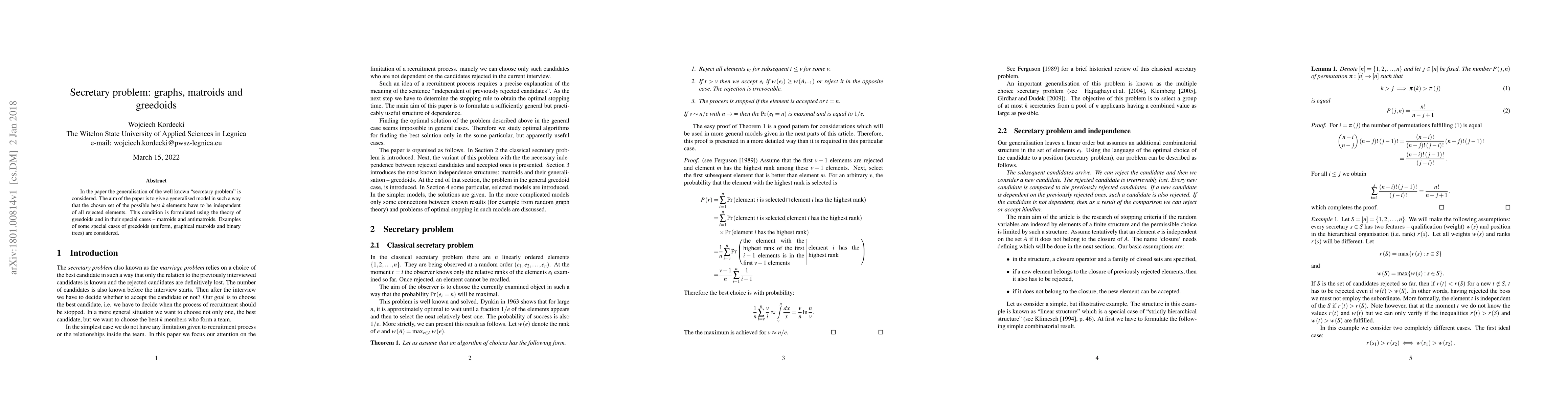 The paper generalizes the "secretary problem" by introducing a model where the selection of the best $k$ elements must be independent of the rejected ones, utilizing the theory of greedoids, with special focus on matroids and antimatroids, and examples include uniform, graphical matroids, and binary trees.