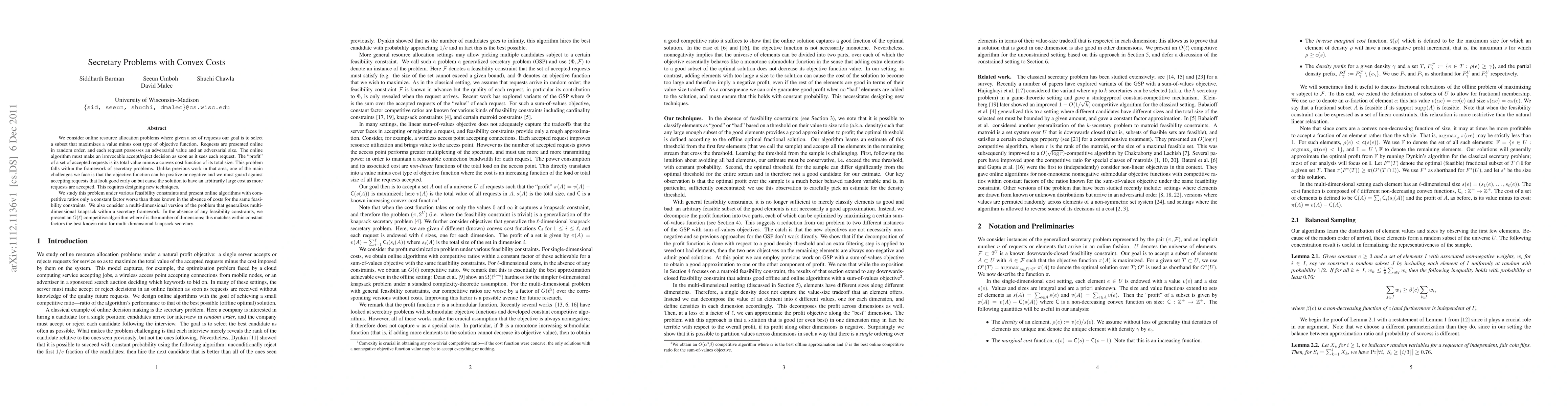 This paper addresses the online resource allocation problem known as the secretary problem with convex costs, where the goal is to maximize value minus cost under adversarial request values and sizes. The authors propose new online algorithms that achieve competitive ratios close to those without costs, even under various feasibility constraints and multi-dimensional extensions.
