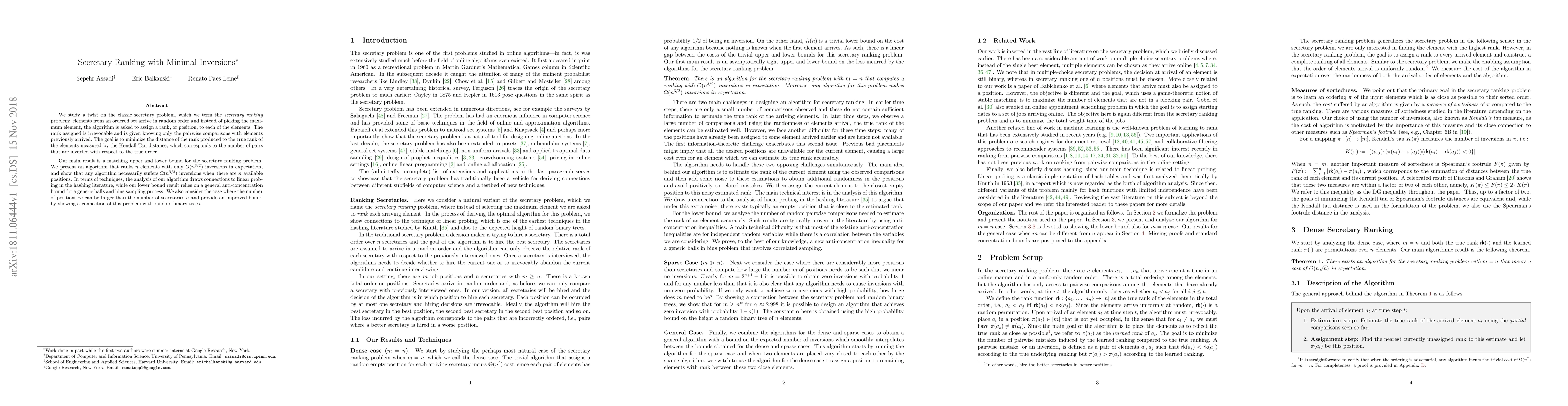 We study a twist on the classic secretary problem, which we term the secretary ranking problem: elements from an ordered set arrive in random order and instead of picking the maximum element, the algorithm is asked to assign a rank, or position, to each of the elements. The rank assigned is irrevocable and is given knowing only the pairwise comparisons with elements previously arrived. The goal is to minimize the distance of the rank produced to the true rank of the elements measured by the Kendall-Tau distance, which corresponds to the number of pairs that are inverted with respect to the true order. Our main result is a matching upper and lower bound for the secretary ranking problem. We present an algorithm that ranks $n$ elements with only $O(n^{3/2})$ inversions in expectation, and show that any algorithm necessarily suffers $\Omega(n^{3/2})$ inversions when there are $n$ available positions. In terms of techniques, the analysis of our algorithm draws connections to linear probing in the hashing literature, while our lower bound result relies on a general anti-concentration bound for a generic balls and bins sampling process. We also consider the case where the number of positions $m$ can be larger than the number of secretaries $n$ and provide an improved bound by showing a connection of this problem with random binary trees.