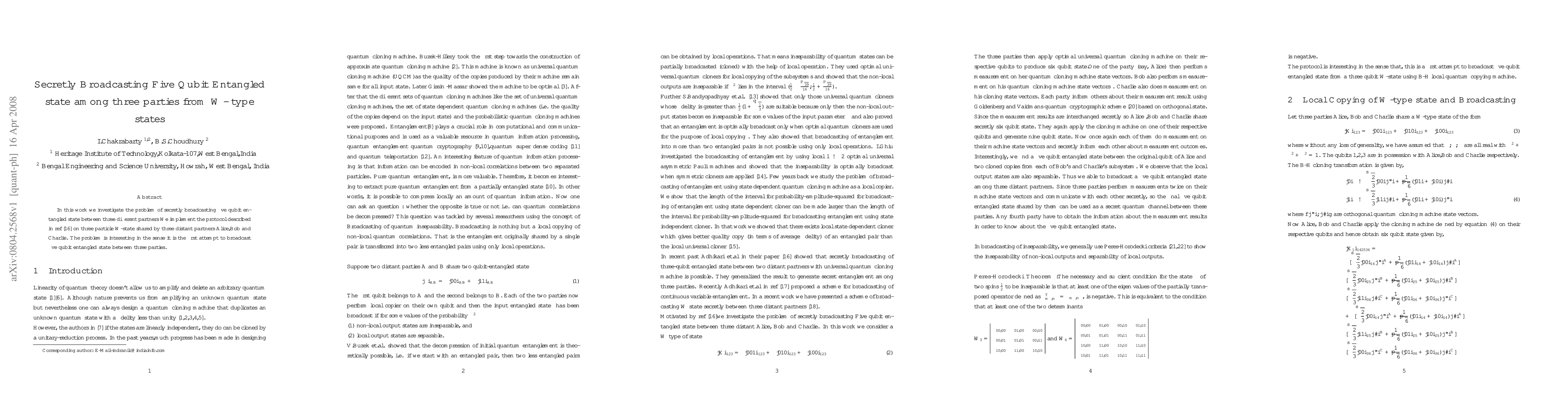 This paper explores the secret broadcasting of a five qubit entangled state among three parties using a protocol based on three-particle W-states. It represents the first attempt to achieve this specific entanglement distribution among multiple parties.