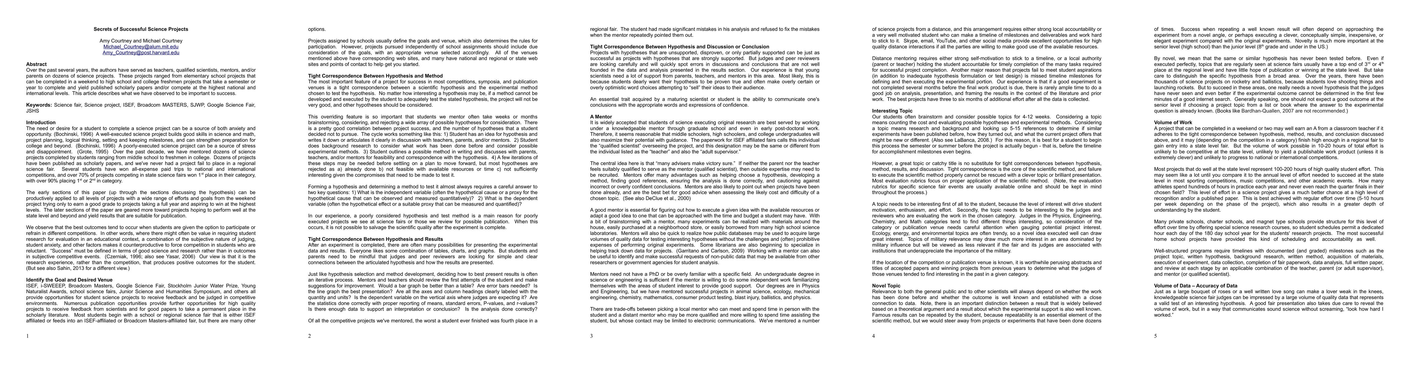 Over the past several years, the authors have served as teachers, qualified scientists, mentors, and/or parents on dozens of science projects. These projects ranged from elementary school projects that can be completed in a weekend to high school and college freshmen projects that take a semester or year to complete and yield published scholarly papers and/or compete at the highest national and international levels. This article describes what we have observed to be important to success.