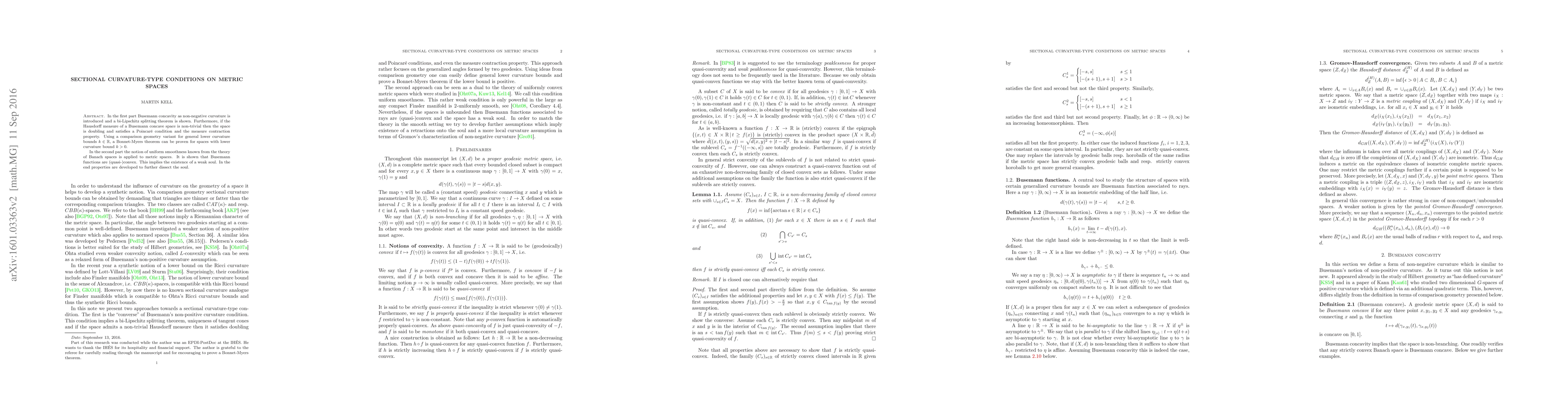 This paper explores Busemann concavity and curvature-type conditions in metric spaces, introducing a bi-Lipschitz splitting theorem for non-negative curvature. It connects Hausdorff measure non-triviality with doubling and Poincaré conditions. A Bonnet-Myers theorem is proven for spaces with $k > 0$ lower curvature bounds. Uniform smoothness is applied to show Busemann functions' (quasi-)convexity, leading to the existence of a weak soul with further dissection properties.