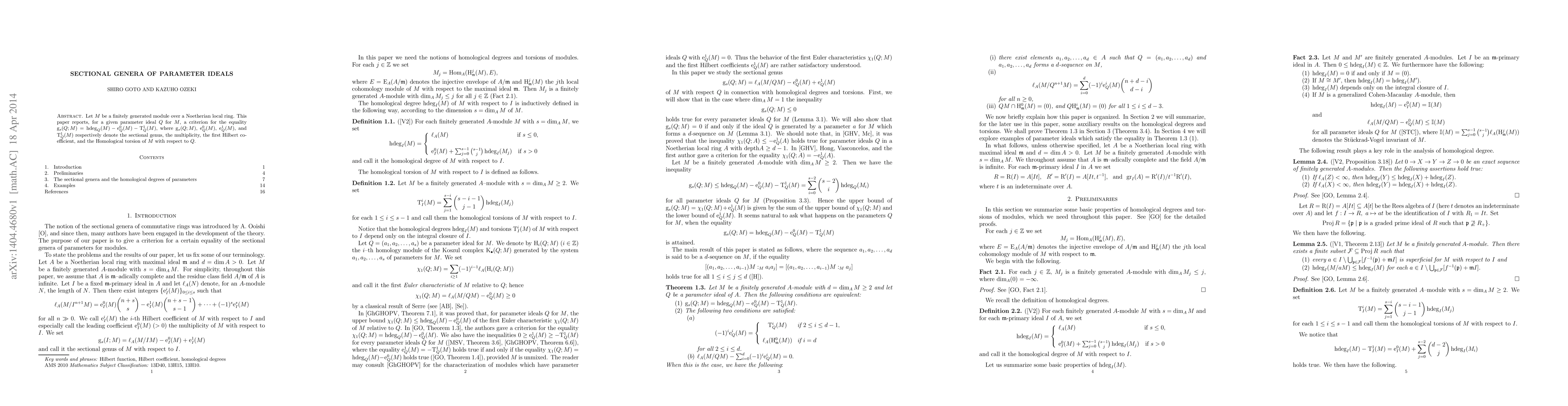 This paper establishes a criterion for the equality of the sectional genus of a parameter ideal $Q$ and a combination of the multiplicity, first Hilbert coefficient, and Homological torsion of a finitely generated module $M$ over a Noetherian local ring. The result provides insight into the structure of $Q$ and its impact on $M$.