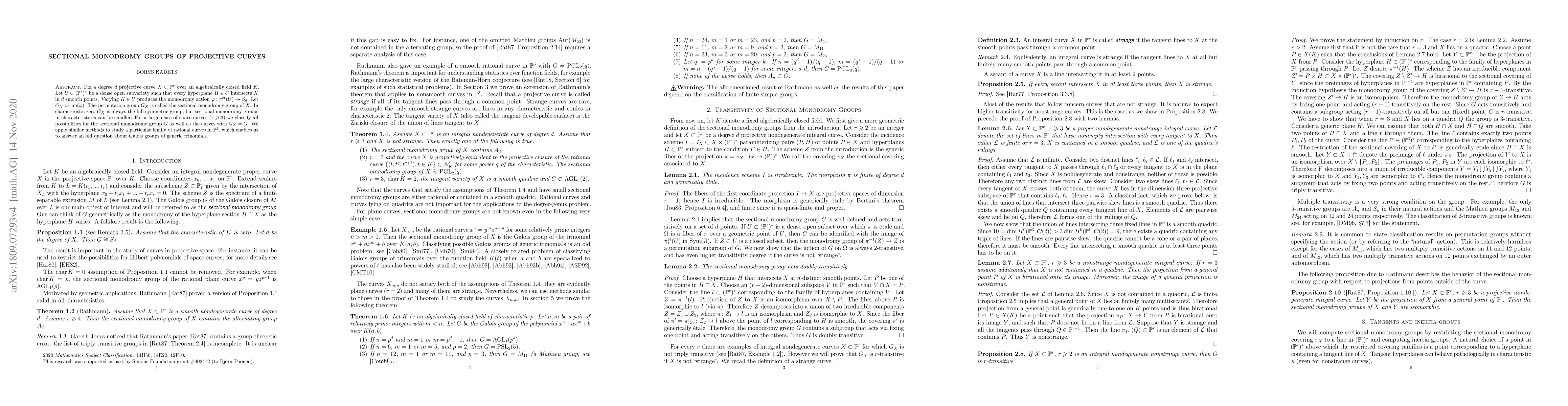 Fix a degree $d$ projective curve $X \subset \mathbb{P}^r$ over an algebraically closed field $K$. Let $U \subset (\mathbb{P}^r)^*$ be a dense open subvariety such that every hyperplane $H \in U$ intersects $X$ in $d$ smooth points. Varying $H \in U$ produces the monodromy action $\varphi: \pi_1^{\text{\'et}}(U) \to S_d$. Let $G_X := \mathrm{im}(\varphi)$. The permutation group $G_X$ is called the sectional monodromy group of $X$. In characteristic zero $G_X$ is always the full symmetric group, but sectional monodromy groups in characteristic $p$ can be smaller. For a large class of space curves ($r \geqslant 3$) we classify all possibilities for the sectional monodromy group $G$ as well as the curves with $G_X=G$. We apply similar methods to study a particular family of rational curves in $\mathbb{P}^2$, which enables us to answer an old question about Galois groups of generic trinomials.