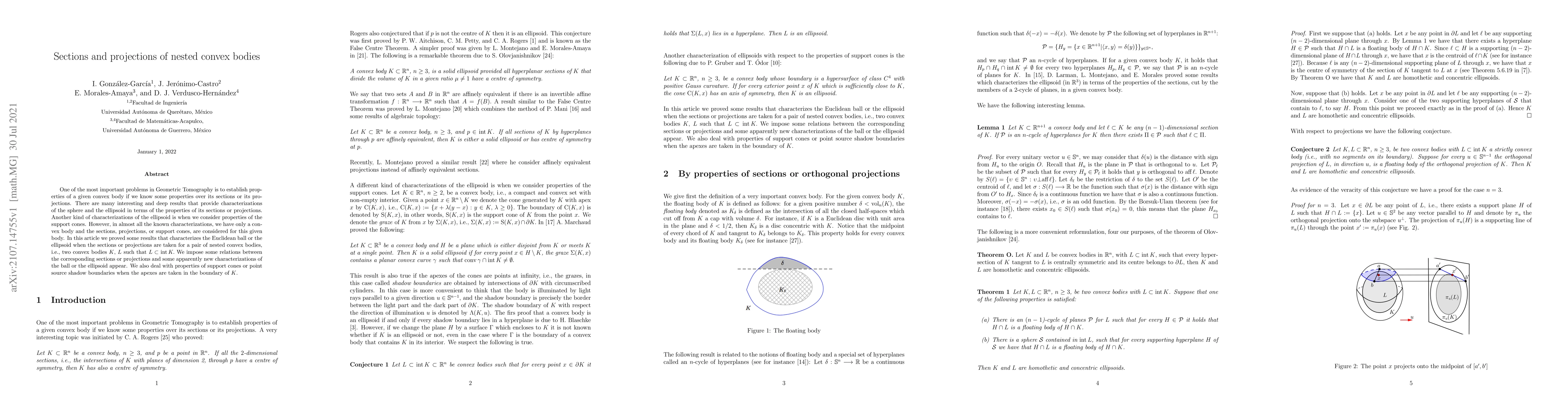 This paper explores characterizations of the Euclidean ball and ellipsoid based on properties of sections or projections of nested convex bodies, introducing new results that link these properties across two nested convex bodies. It also examines support cones and point source shadow boundaries for the outer convex body.