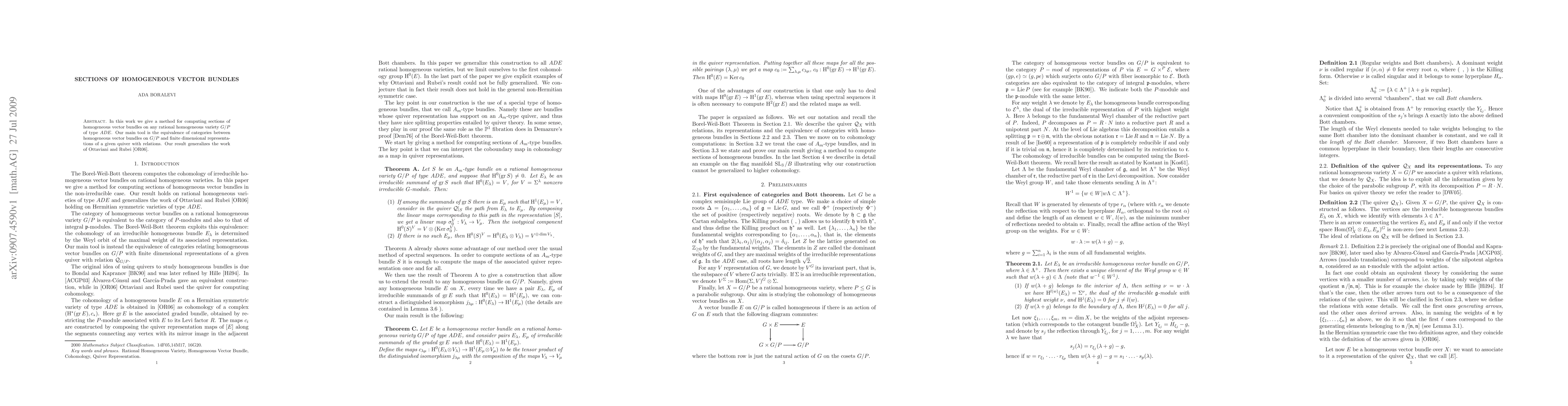 This paper presents a method for calculating sections of homogeneous vector bundles on rational homogeneous varieties of type ADE, leveraging an equivalence between these bundles and representations of a specific quiver with relations, thus extending previous work by Ottaviani and Rubei.