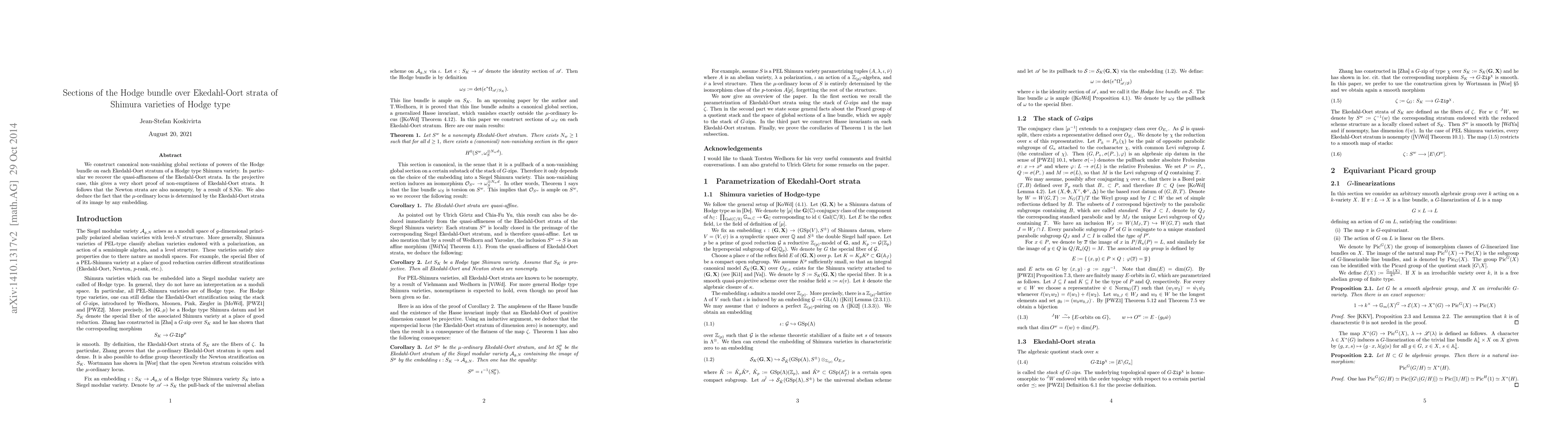 We construct canonical non-vanishing global sections of powers of the Hodge bundle on each Ekedahl-Oort stratum of a Hodge type Shimura variety. In particular we recover the quasi-affineness of the Ekedahl-Oort strata. In the projective case, this gives a very short proof of non-emptiness of Ekedahl-Oort strata. It follows that the Newton strata are also nonempty, by a result of S.Nie. We also deduce the fact that the $\mu$-ordinary locus is determined by the Ekedahl-Oort strata of its image by any embedding.