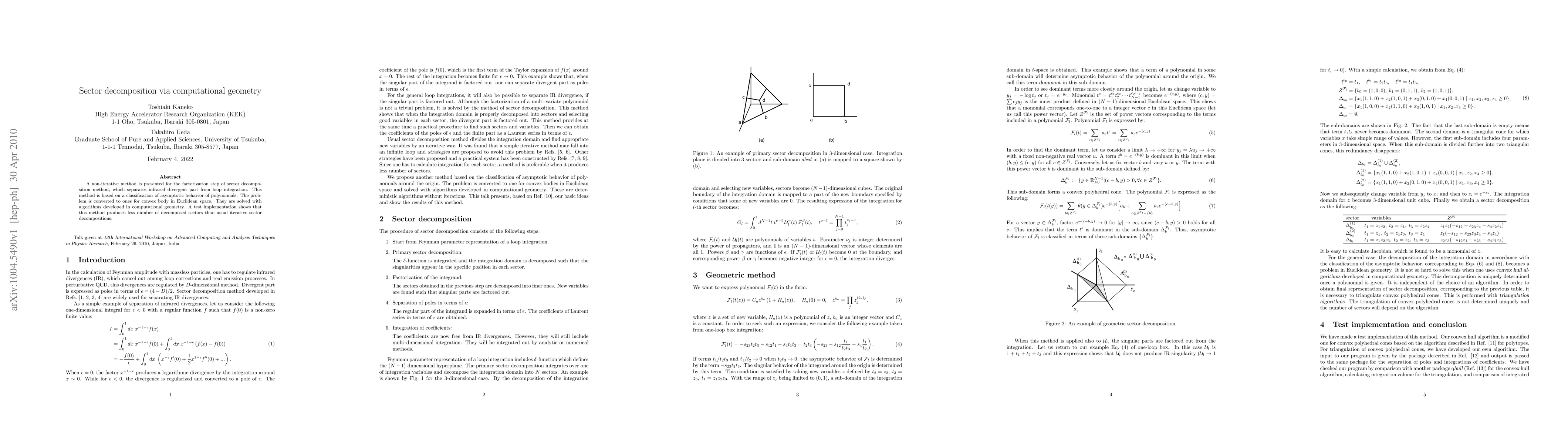 A non-iterative method is presented for the factorization step of sector decomposition method, which separates infrared divergent part from loop integration. This method is based on a classification of asymptotic behavior of polynomials. The problem is converted to ones for convex body in Euclidean space. They are solved with algorithms developed in computational geometry. A test implementation shows that this method produces less number of decomposed sectors than usual iterative sector decompositions.