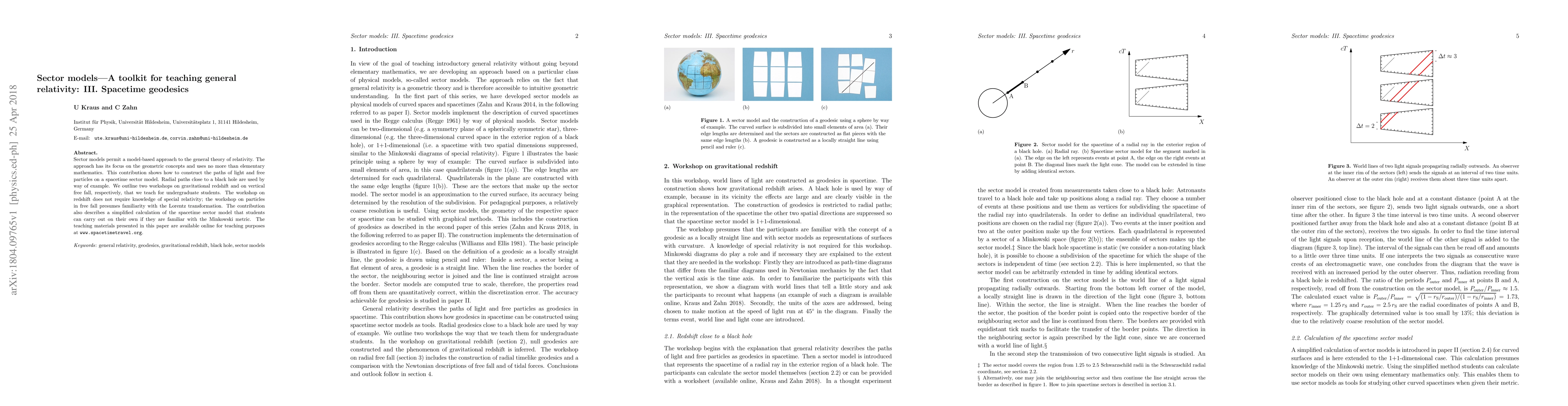 This paper presents sector models as a simplified tool for teaching general relativity, focusing on geometric concepts using elementary mathematics to illustrate the paths of light and free particles, exemplified by radial paths near a black hole. It includes workshops on gravitational redshift and vertical free fall for undergraduates and offers online teaching materials.