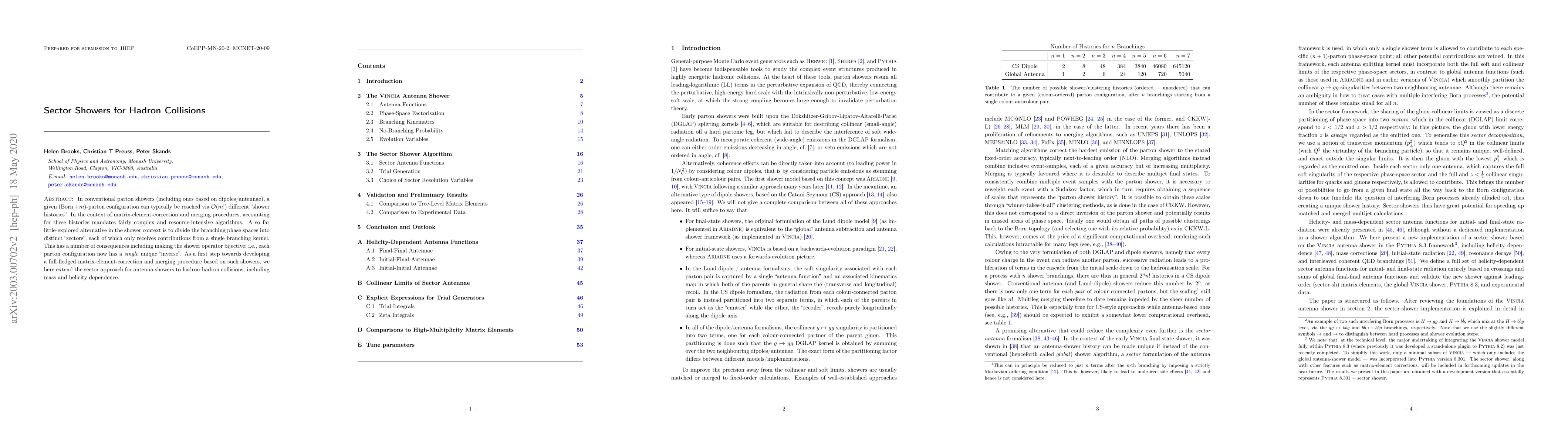In conventional parton showers (including ones based on dipoles/antennae), a given $(\mathrm{Born}+m)$-parton configuration can typically be reached via ${\mathcal O}(m!)$ different "shower histories". In the context of matrix-element-correction and merging procedures, accounting for these histories mandates fairly complex and resource-intensive algorithms. A so far little-explored alternative in the shower context is to divide the branching phase spaces into distinct "sectors", each of which only receives contributions from a single branching kernel. This has a number of consequences including making the shower operator bijective; i.e., each parton configuration now has a single unique "inverse". As a first step towards developing a full-fledged matrix-element-correction and merging procedure based on such showers, we here extend the sector approach for antenna showers to hadron-hadron collisions, including mass and helicity dependence.