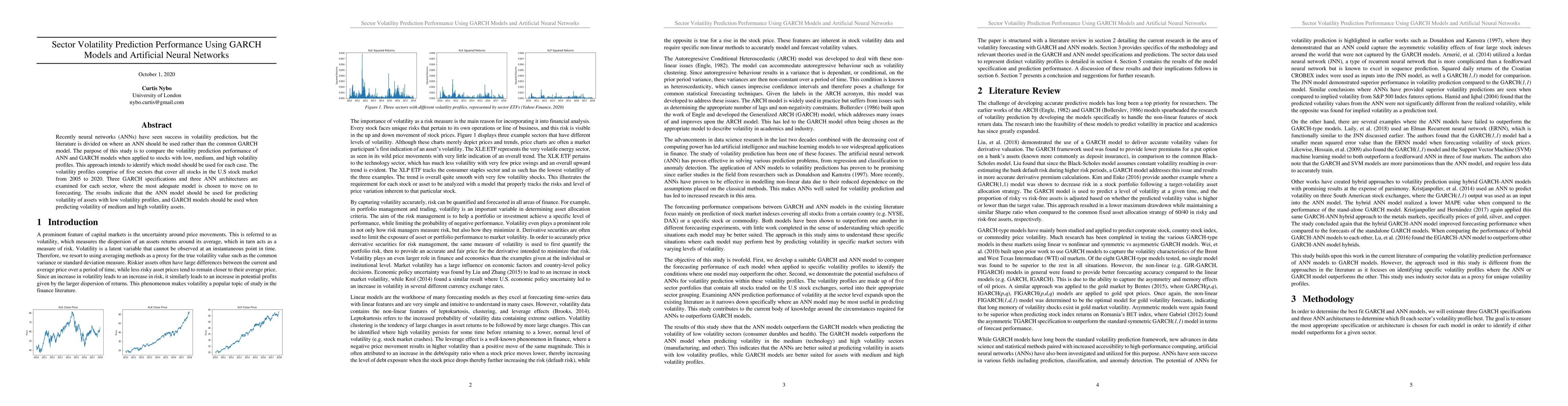 This study compares the volatility prediction performance of ANN and GARCH models across different sectors of the U.S. stock market. The results suggest that ANNs are more effective for low volatility stocks while GARCH models perform better for medium and high volatility assets.