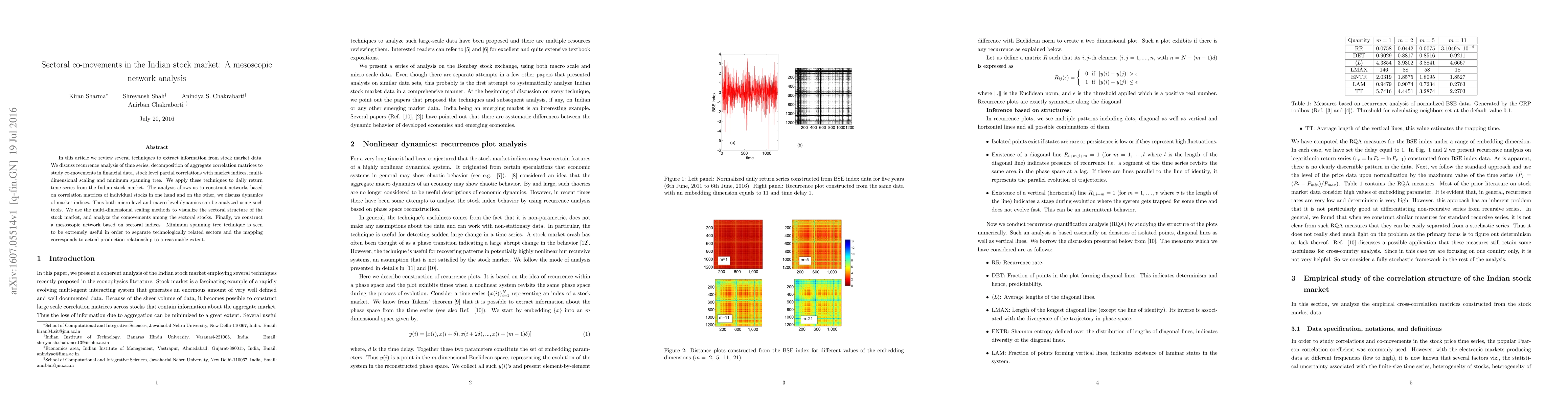 This paper employs various techniques to analyze co-movements in the Indian stock market, constructing networks based on correlation matrices and sectoral indices. It uses multidimensional scaling and minimum spanning tree methods to visualize sectoral structures and identify technologically related sectors, revealing significant sectoral co-movements.