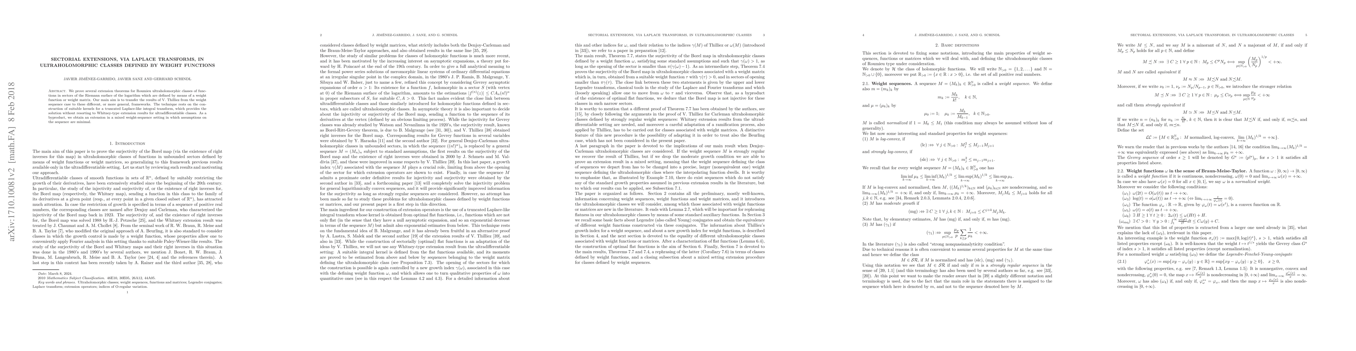 This paper proves extension theorems for Roumieu ultraholomorphic classes using Laplace transforms and weight functions, extending V. Thilliez's results from weight sequences to more general frameworks. The method employs a truncated Laplace-like integral transform, avoiding Whitney-type extensions.