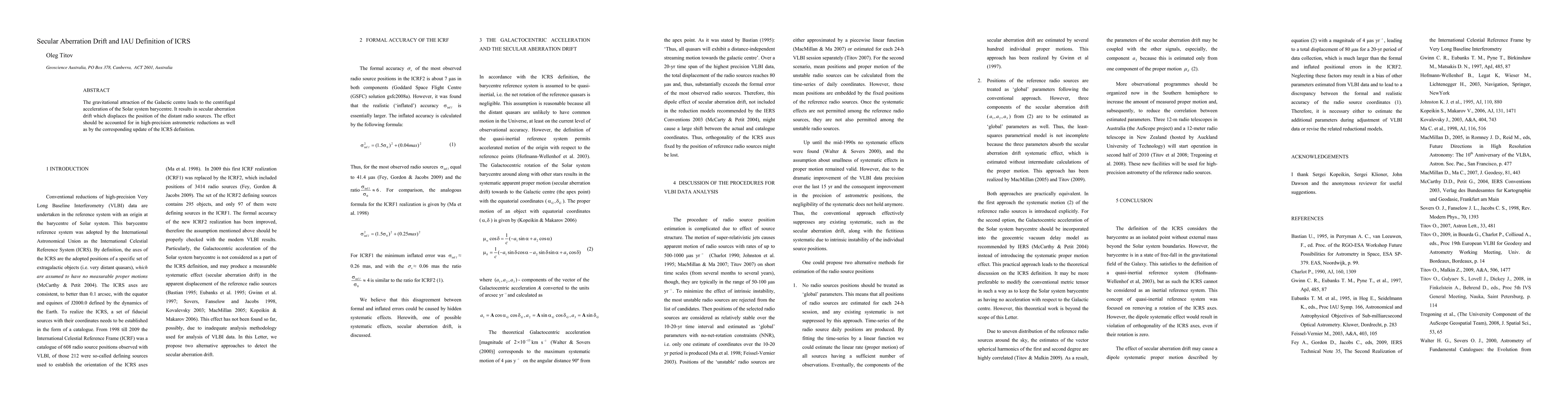 Summary: The paper discusses the gravitational influence of the Galactic centre causing secular aberration drift, which shifts the positions of distant radio sources, necessitating precise astrometric corrections and updates to the International Celestial Reference System (ICRS) definition.