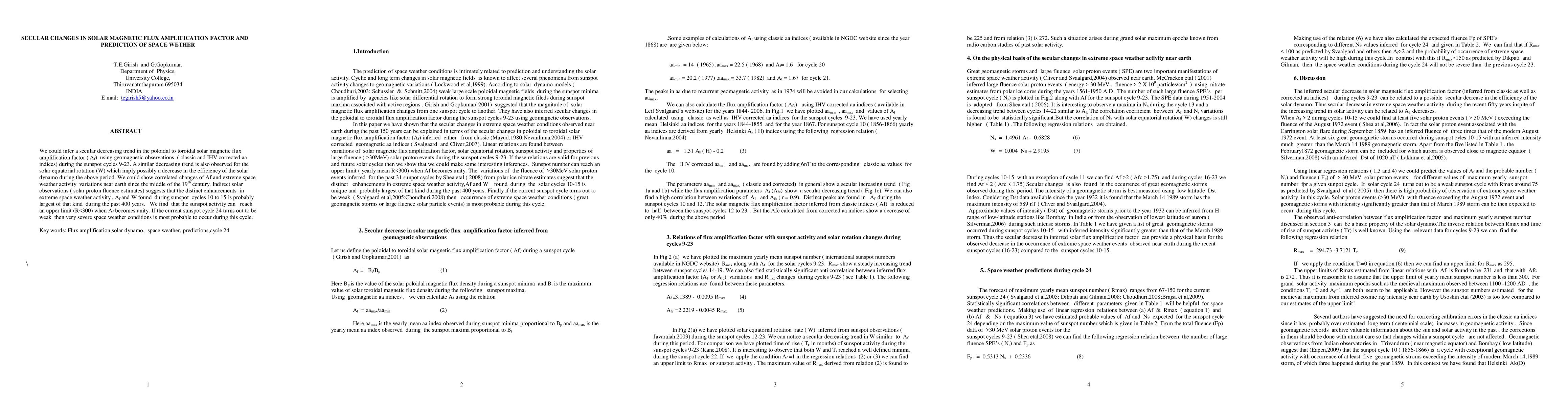 Researchers found a secular decreasing trend in solar magnetic flux amplification factor, suggesting a possible decrease in solar dynamo efficiency during sunspot cycles 9-23. A weak sunspot cycle 24 may lead to severe space weather conditions.