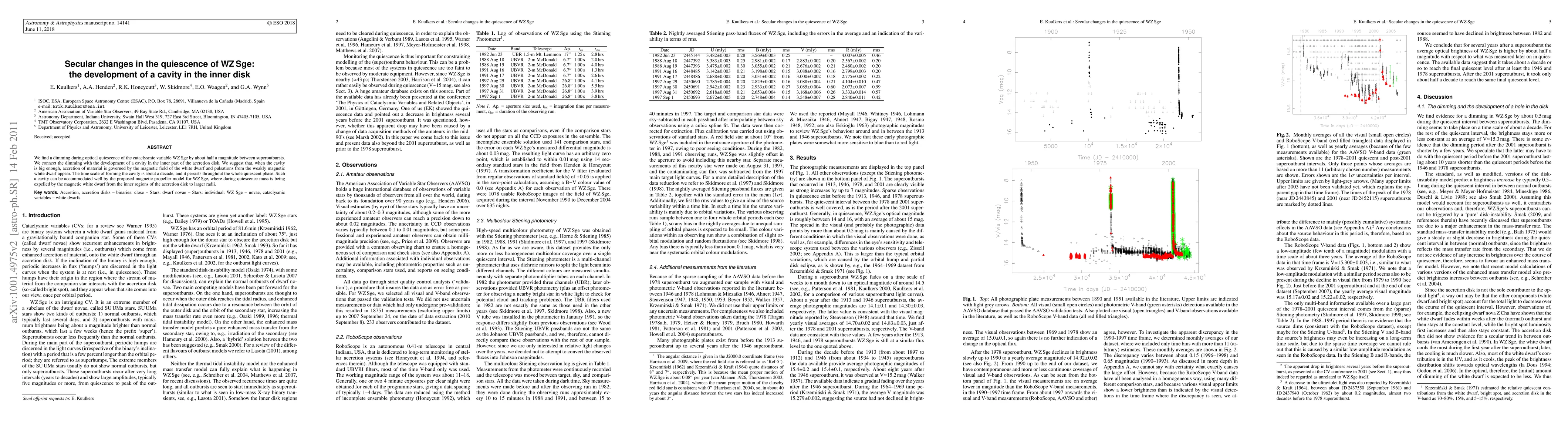 The research identifies a half-magnitude dimming in the optical quiescence of the cataclysmic variable WZ Sge, attributing it to the growth of a cavity in the inner accretion disk. This cavity formation, occurring over a decade, is linked to white dwarf magnetic field governance of accretion and potential weakly magnetic white dwarf pulsations, aligning with the magnetic propeller model.