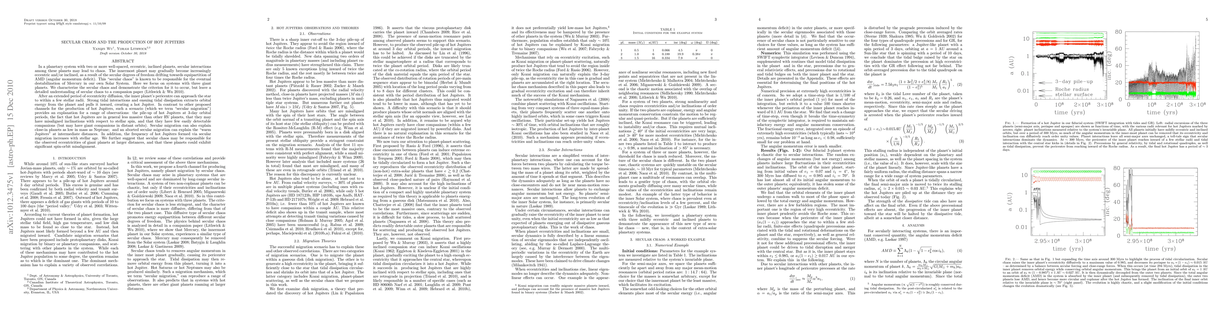 This paper explores how secular chaos among three giant planets in a system can lead to the formation of hot Jupiters through a process termed "secular migration." It explains how tidal dissipation drives the innermost planet inward after extended eccentricity diffusion, addressing various observational features of hot Jupiters.